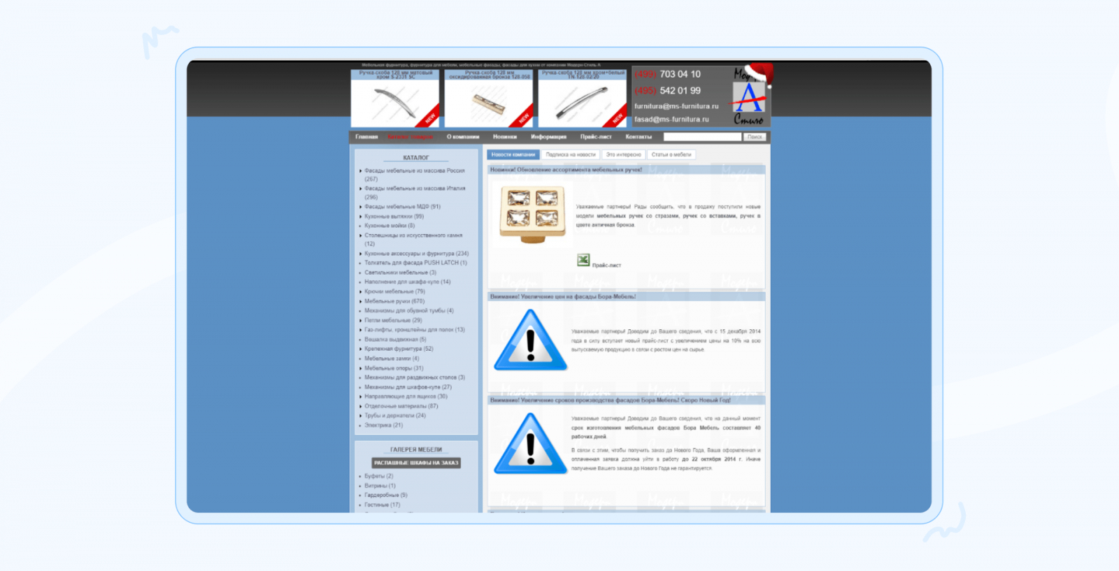 Представьте себе витрину в продуктовом магазине — причем товары вы видите, а ценников на них нет. Вот таким же образом работал старый сайт. Был каталог товаров, был прайс-лист, который высылался только по запросу, причем сразу на всю продукцию. Попросить: «А можно мне цену только на этот товар?» было нельзя. На самом сайте где-то были изображения товаров, где-то нет. Никаких цен или корзины не было от слова совсем.
