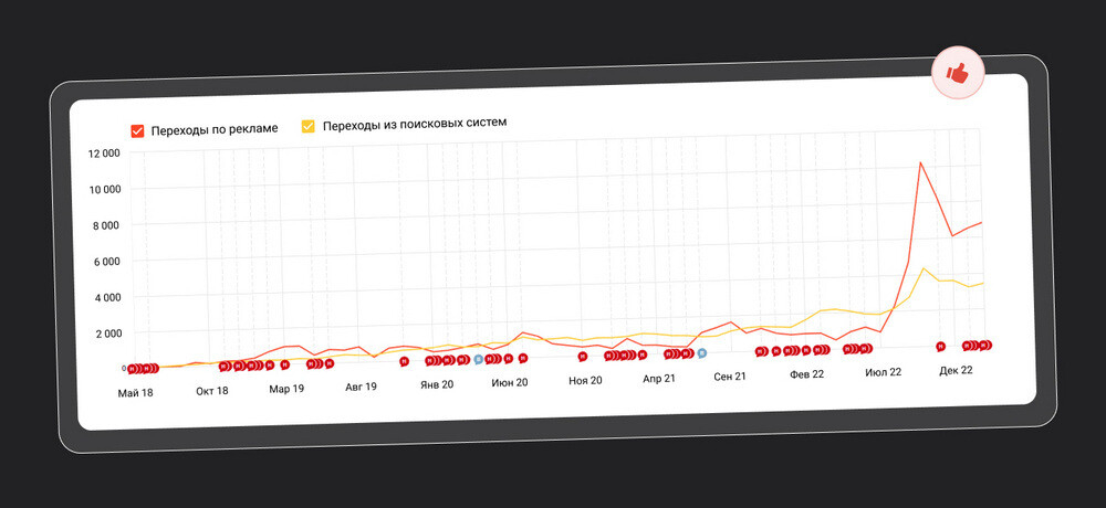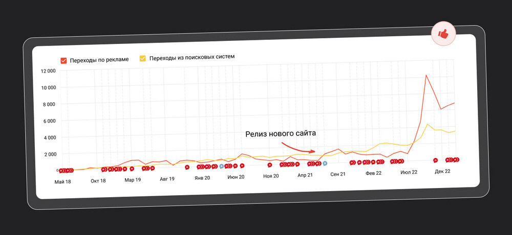 Вот как выглядит динамика трафика за все 5 лет нашей работы: спокойный последовательный рост с небольшими предсказуемыми спадами на новогодние праздники. С середины 2021 года трафика стало заметно больше — это результат того, что мы запустили новый сайт.