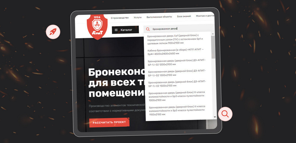 Умный поиск. Пользователь начинает набирать «бронированная дверь», и ему сразу же вываливается куча подсказок, как на маркетплейсе. Это важно, потому что если пользователь за пару кликов не нашел, что искал, он решает, что сайт ему не подходит и возвращается обратно в поиск. А если пользователь вернулся в поиск слишком быстро, пробыл на сайте недолго, не совершил никаких целевых действий, то это знак для поисковых систем, что сайт неудобный и что его нужно ранжировать ниже.