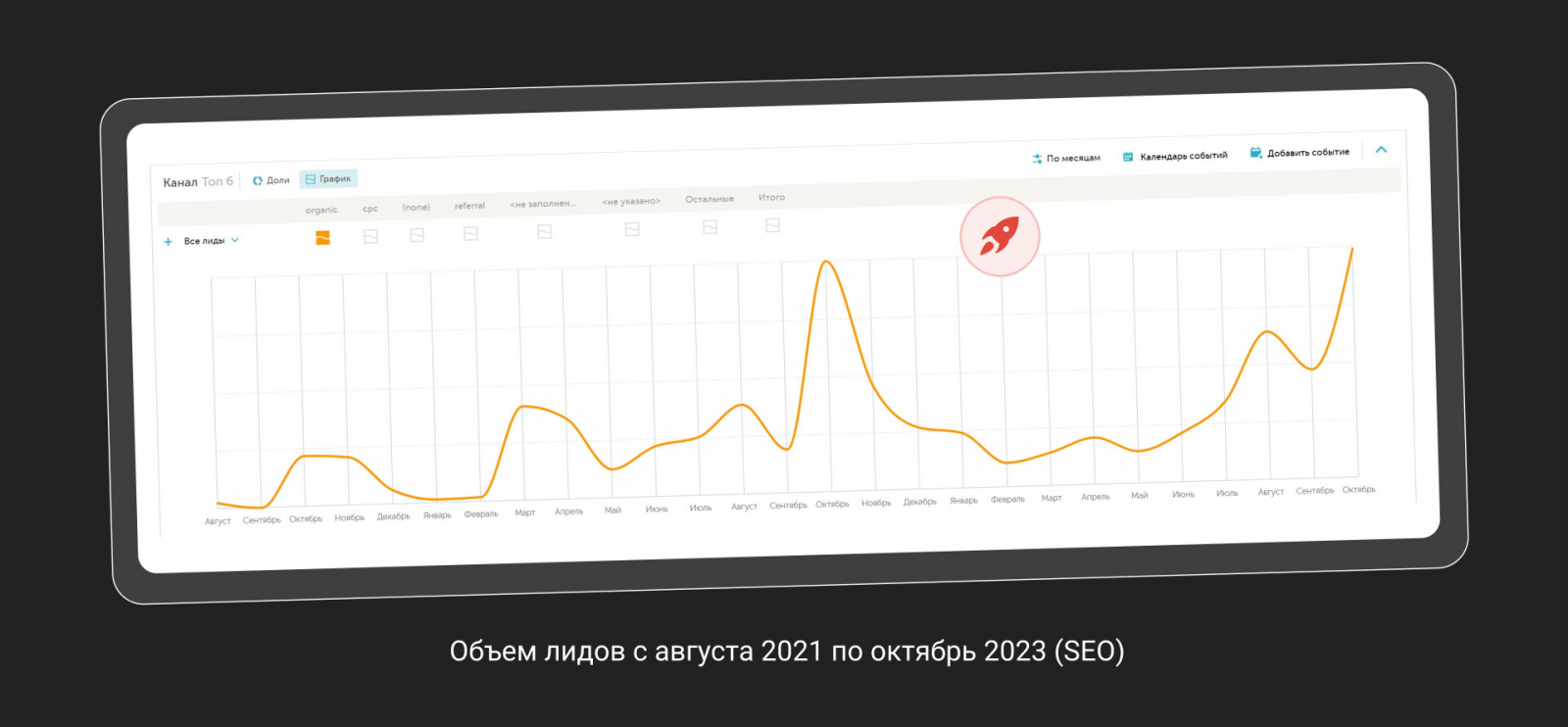 Вот так у нас выглядит объем лидов конкретно с поискового продвижения. Вы можете спросите, а что это за пик? Почему в октябре 22-го года так много искали бронеконструкций и так много было лидов? Все просто: это был период мобилизации. Некоторые организации пересмотрели свои потребности в безопасности, плюс в целом настроение в стране поменялось. Наш сайт уже был готов к повышенном спросу, таким образом мы забрали львиную долю трафика, а соответственно и заказов.