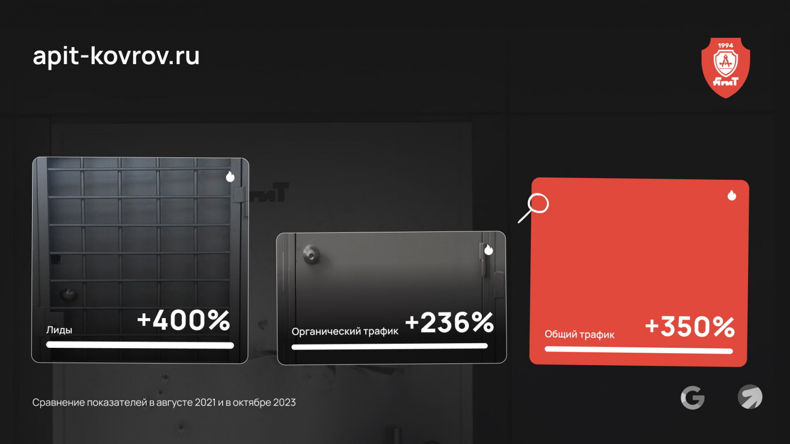 Пять лет назад компания «АПИТ» пришла к нам за услугой комплексного продвижения с «нулевым» сайтом. Сейчас это совершенно другой ресурс: изменился визуал, структура, наполнение. Устойчивые показатели роста фиксируются как по органическому трафику, так и по продажам.