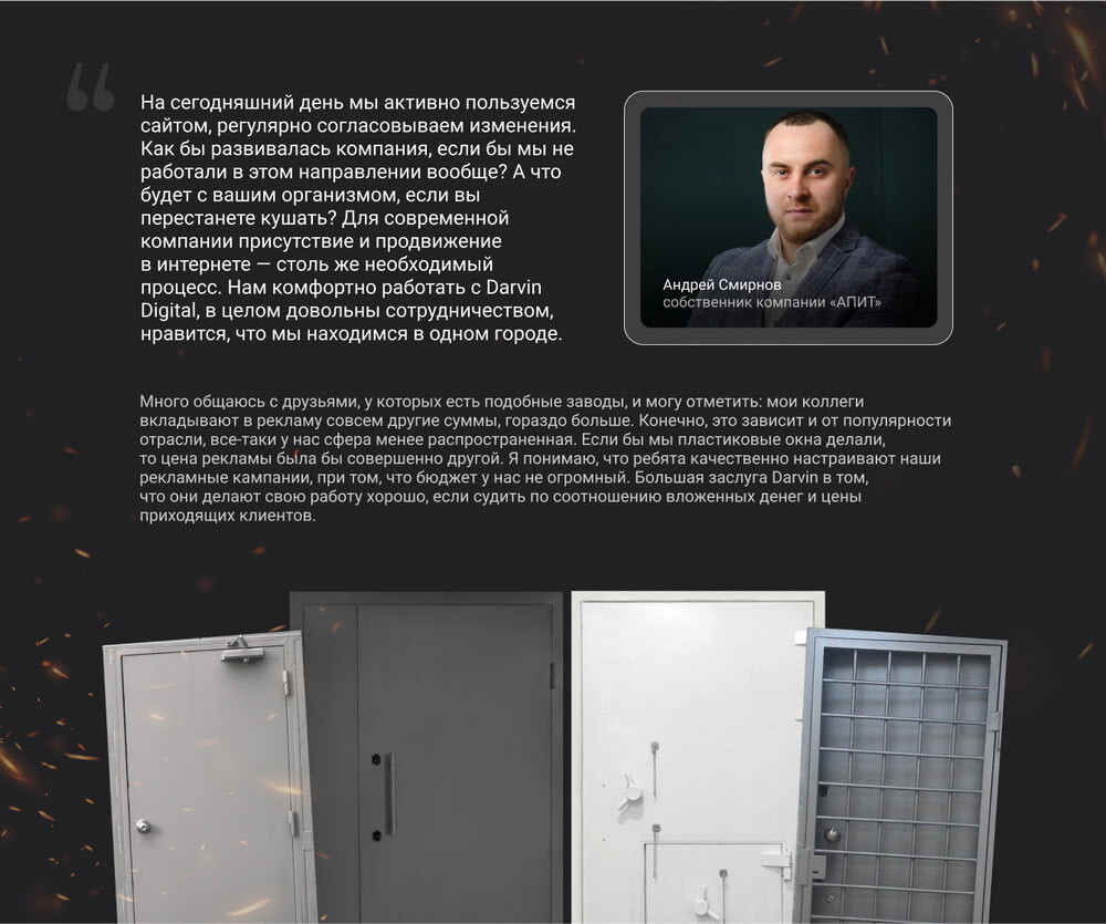 Компания «АПИТ» из города Коврова занимается разработкой, производством и установкой различных видов бронеконструкций и защитного оборудования (двери, решетки, ворота, бронепанели, посты охраны, КПП, специальные помещения и т.д.) История «АПИТ» начинается в 1994 году, к сегодняшним собственникам компания перешла 5 лет назад. Тогда два партнера, Андрей Смирнов и Дмитрий Кудряков, приняли решение вести совместный бизнес. У них был выход на достаточно закрытый рынок — рынок безопасности по элементам технической укрепленности для банковской сферы. Бронирование касс, сейфов, комнат-хранилищ во многих банках произведено компанией «АПИТ» («Россельхозбанк», «Газпром», «Открытие» и другие).