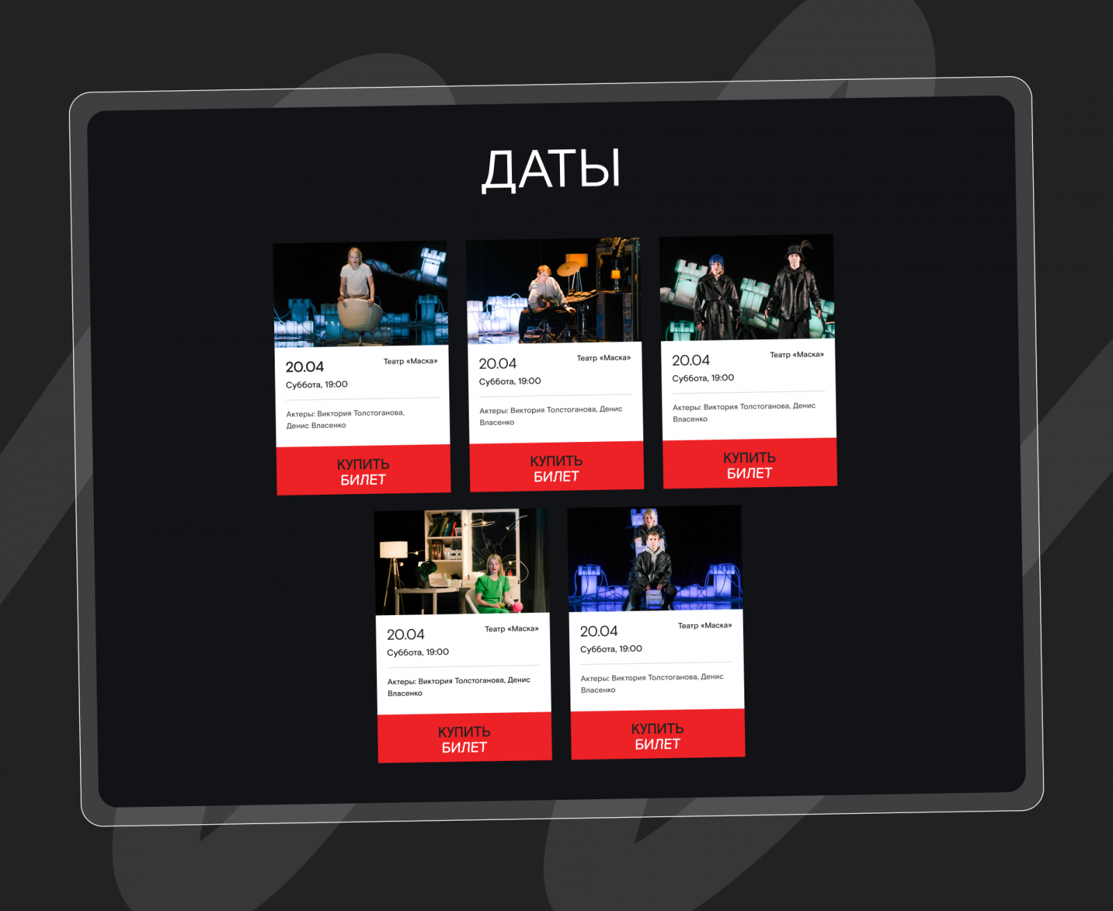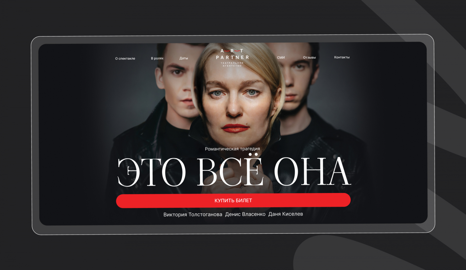 Мы обсуждаем эту ситуацию с клиентом и вместе решаем разработать несколько лендингов, которые продавали бы билеты на важные премьеры. В кейсе пойдет речь об одном из них: лендинге для спектакля «Это всё она».