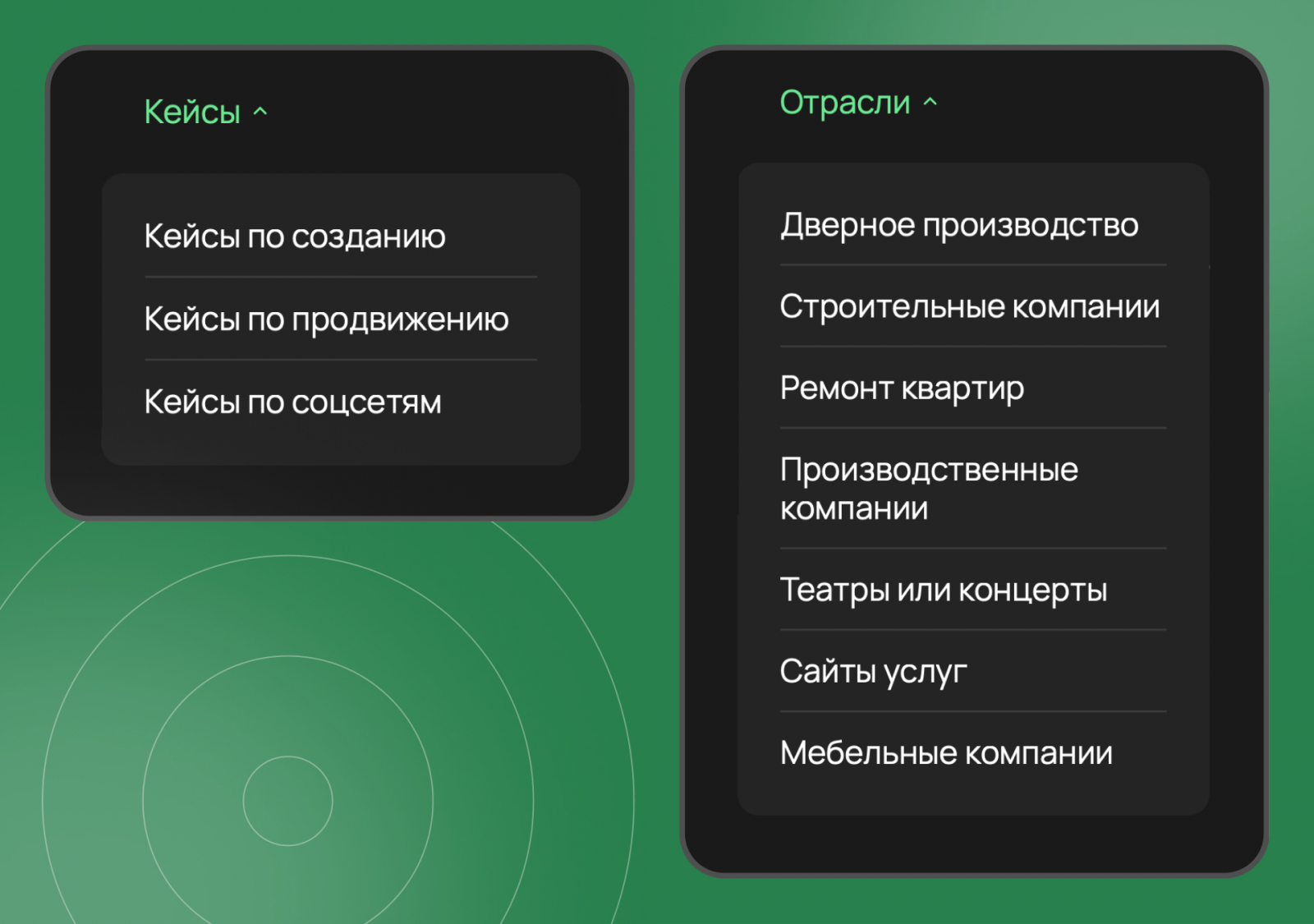 Не просто описали услугу-1 и услугу-2, а подробно расписали что конкретно мы предлагаем для каждой отрасли – выводим в ТОП поисковых систем Яндекс и Google, результаты работы.