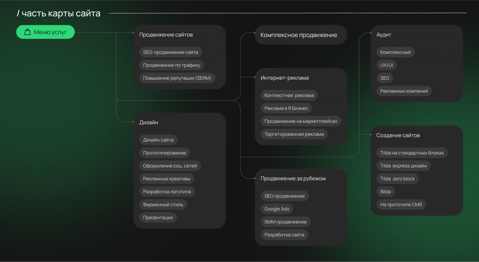 В результате получил каркас сайта без лишнего, где каждая страница решает свою задачу. На этом этапе важно не забывать, что UX – это не про удобные кнопки, а про смысловую навигацию. Люди не читают, они бегло сканируют ваш сайт. И если логика не работает, визуал не спасёт.