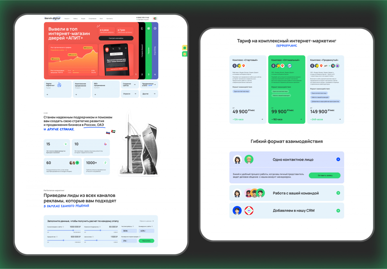Darvin Digital на рынке с 2008 года. За плечами сотни маркетинговых стратегий, успешных рекламных кампаний, SEO для eCommerce и сурового B2B, сайты разного уровня сложности, аудиты, дизайн, контент. Клиенты – B2B-компании, девелоперы, промышленные бренды, маркетплейсы, eCom и даже заводы.