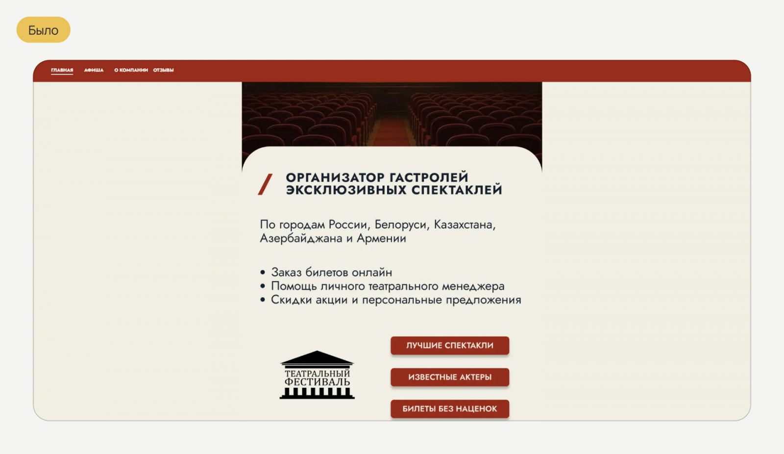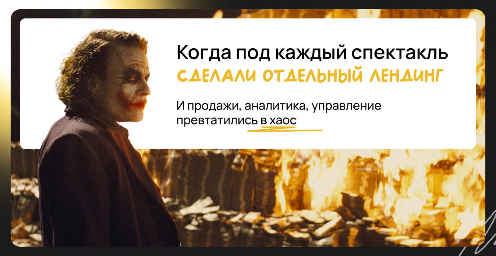 Под каждый спектакль создавали отдельный лендинг на конструкторе Tilda. С ростом количества городов и премьер таких страниц стало десятки. С одной стороны – простая система продажи билетов, с другой – большое количество разрозненных мини-сайтов с продублированным контентом. Сначала такая схема казалась удобной: есть событие → создаём страницу → запускаем рекламу и продаём билеты. Но чем быстрее рос бизнес, тем больше возникало проблем: