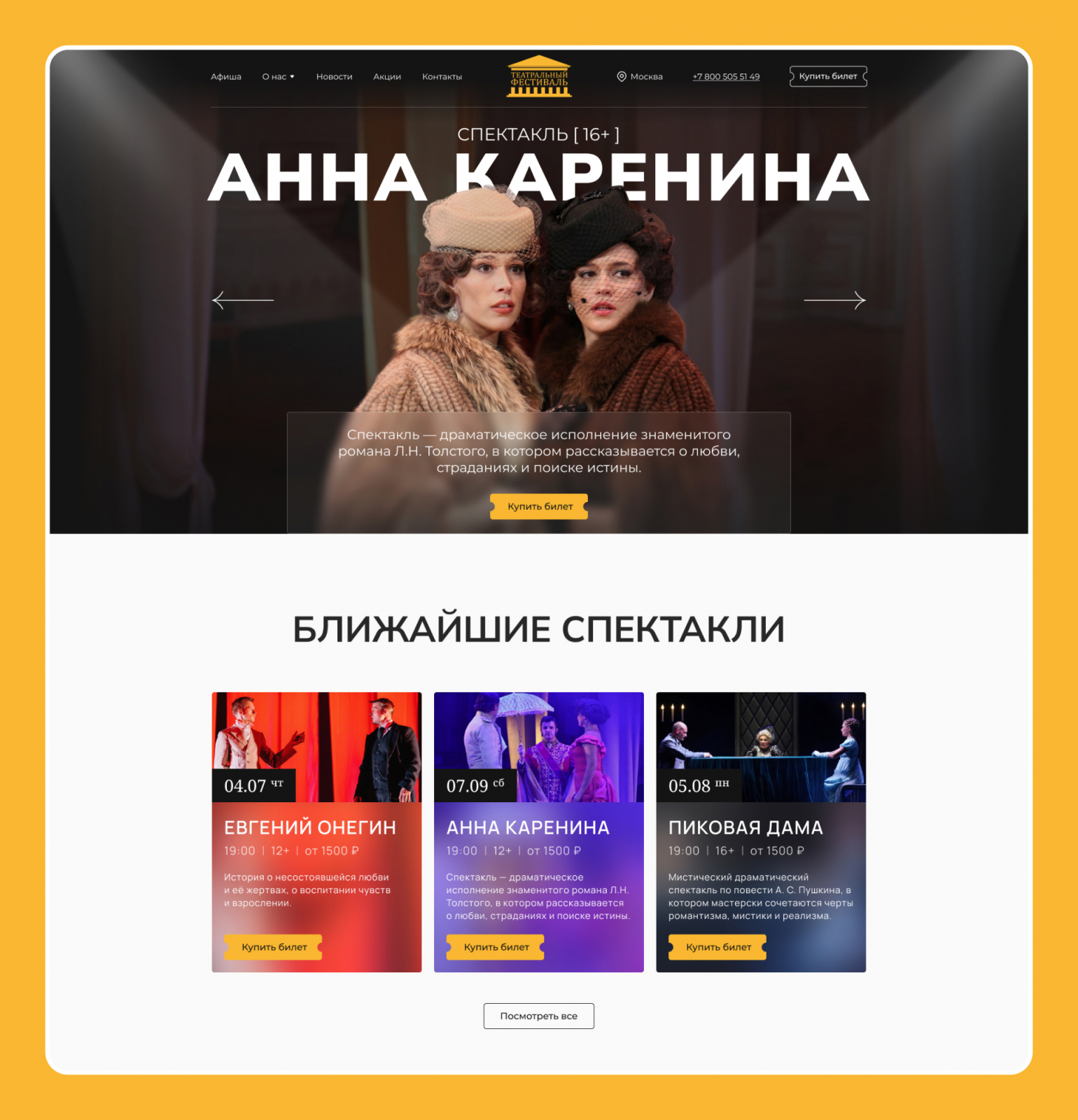 Этот вариант создал нужное первое впечатление: яркое, выразительное, эмоционально заряженное. Он сразу погружает пользователя в нужный контекст и задавал настроение для дальнейшего взаимодействия с афишей и спектаклями.