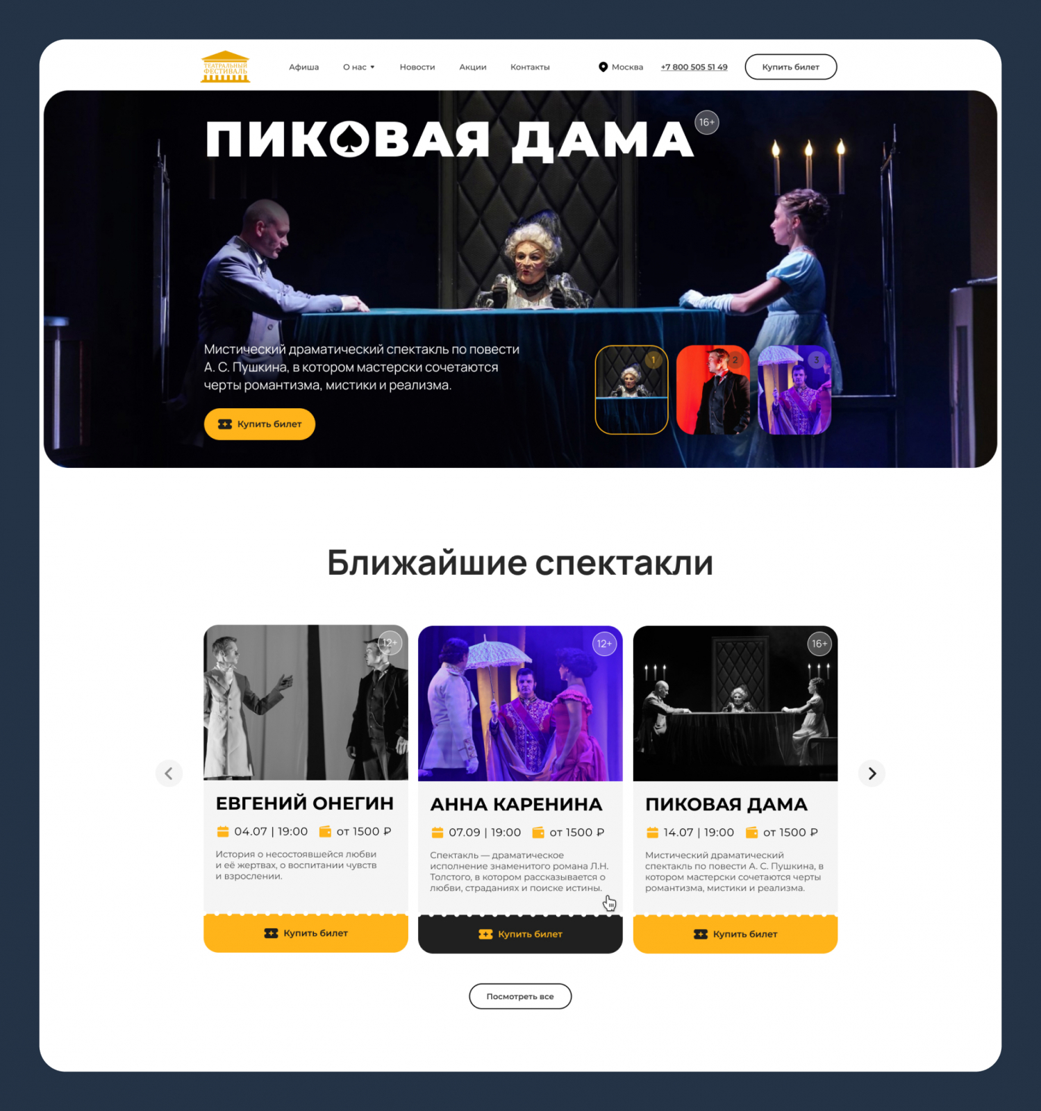 Этот дизайн делает ставку на фотографии – никаких лишних украшений, только визуал самих спектаклей. Картинки говорят за себя: атмосферные, выразительные, они передают настроение постановок без дополнительных графических элементов.