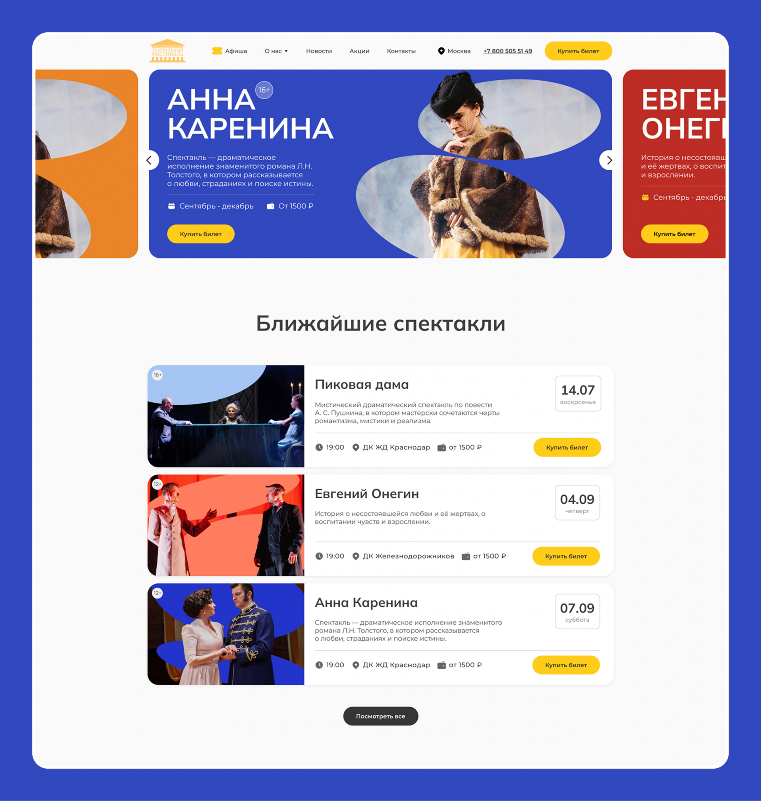 Самая сложная часть – билетная система. Одно из ключевых требований было связано с главной страницей: баннеры должны быть «живыми». То есть это не просто картинки с кнопкой, а элементы, которые автоматически тянут за собой дату, город и цену из билетной системы. То есть нажимаешь – и сразу попадаешь на страницу с нужным спектаклем.