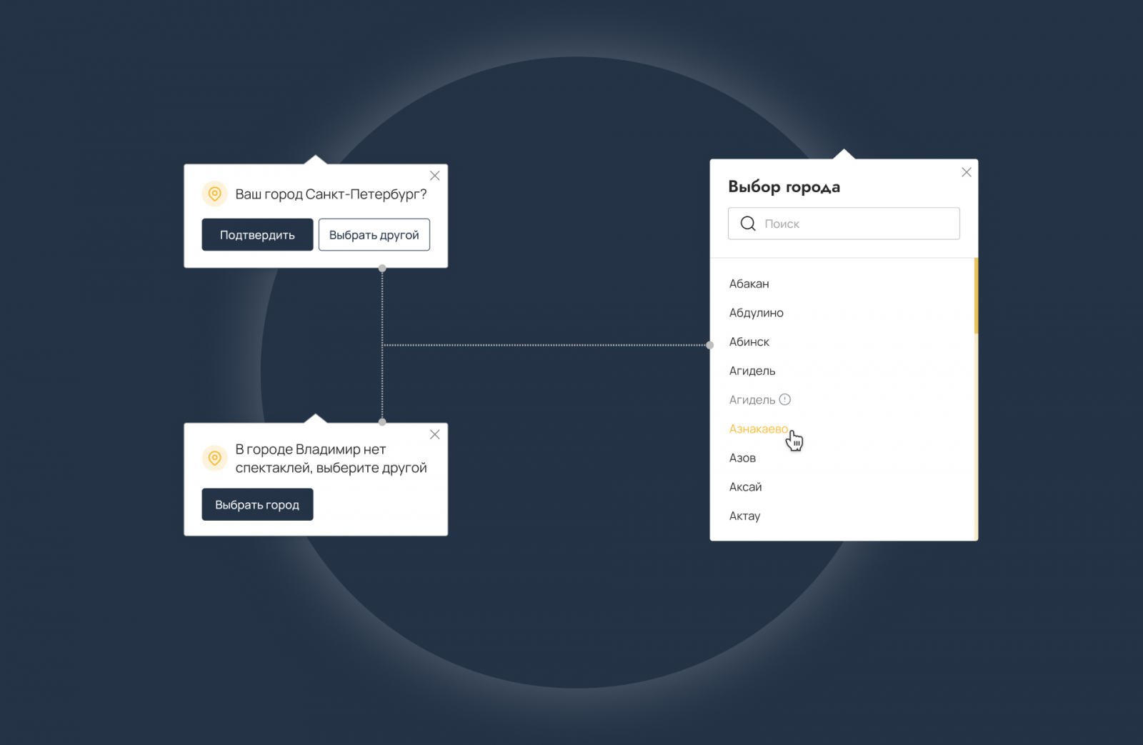 В афише мы сделали акцент на удобный и гибкий поиск. Пользователь может отфильтровать спектакли сразу по нескольким городам – это особенно важно, если он следит за событиями в разных регионах или планирует поездку.