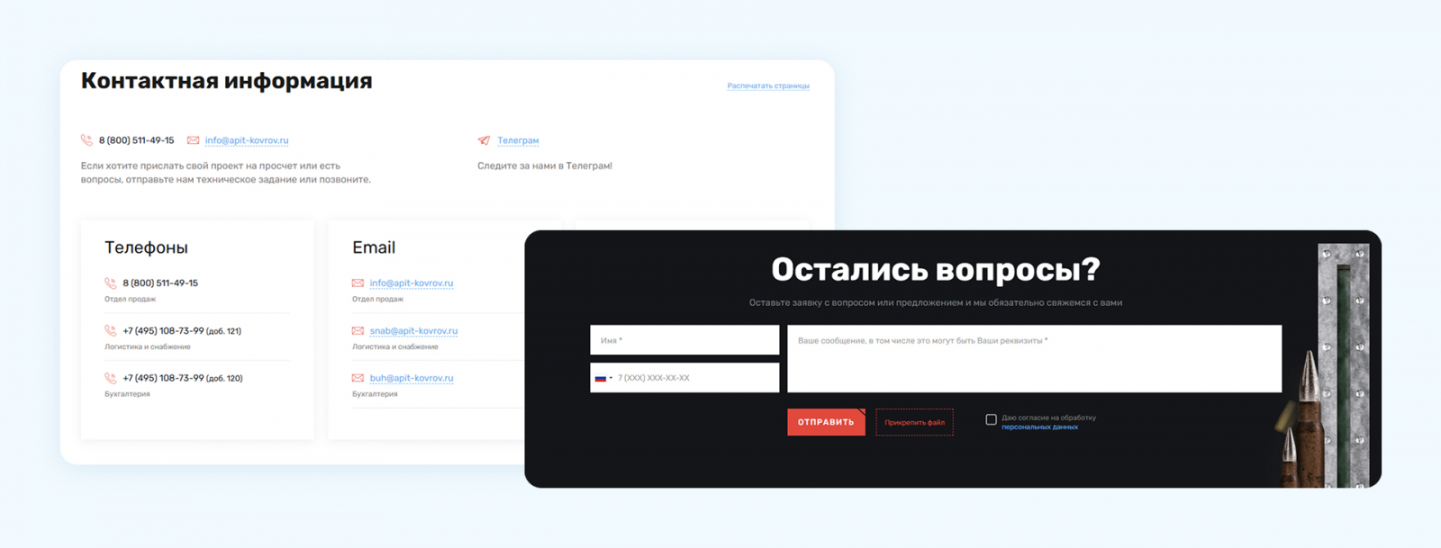 В случае НПП «Энергия» была и дополнительная причина – юридическая. Чтобы разместить форму обратной связи, нужно зарегистрироваться в Роскомнадзоре как оператор персональных данных. На старте клиент решил отложить этот шаг, поэтому в качестве каналов связи были использованы телефон и мессенджеры в разделе «Контакты».