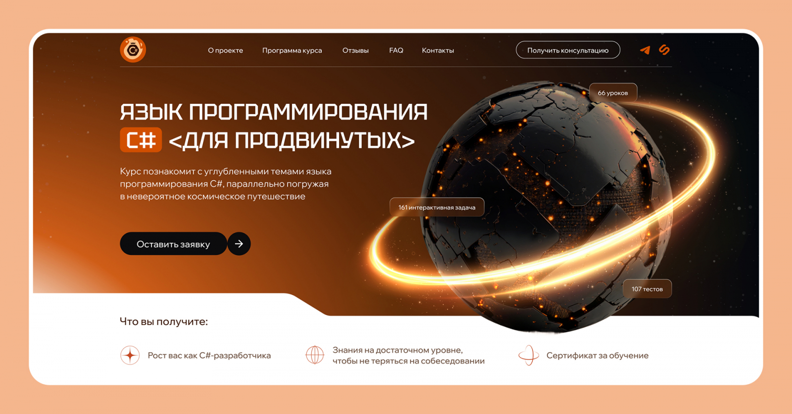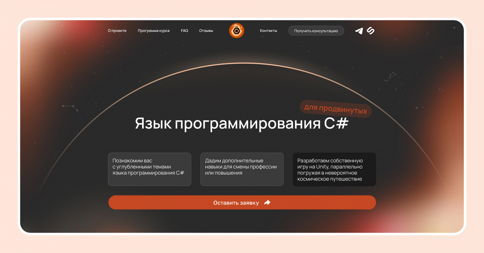 На лендинге эту механику важно было не просто упомянуть, а объяснить. C# для многих звучит как что-то сложное. И если человек видит на странице только общие слова про пользу и карьеру, тревога никуда не уходит. А когда формат обучения разложен по-человечески, становится спокойнее: понятно, как именно будет устроен процесс и почему он не выглядит как бесконечные лекции. Этот процесс позволяет повысить вовлеченность к обучению, превращая сложные темы в интересный челлендж, а также поддерживает интерес на всем протяжении курса.