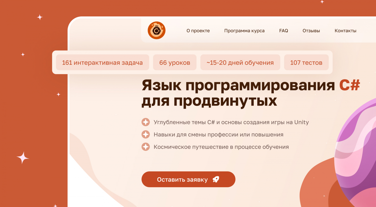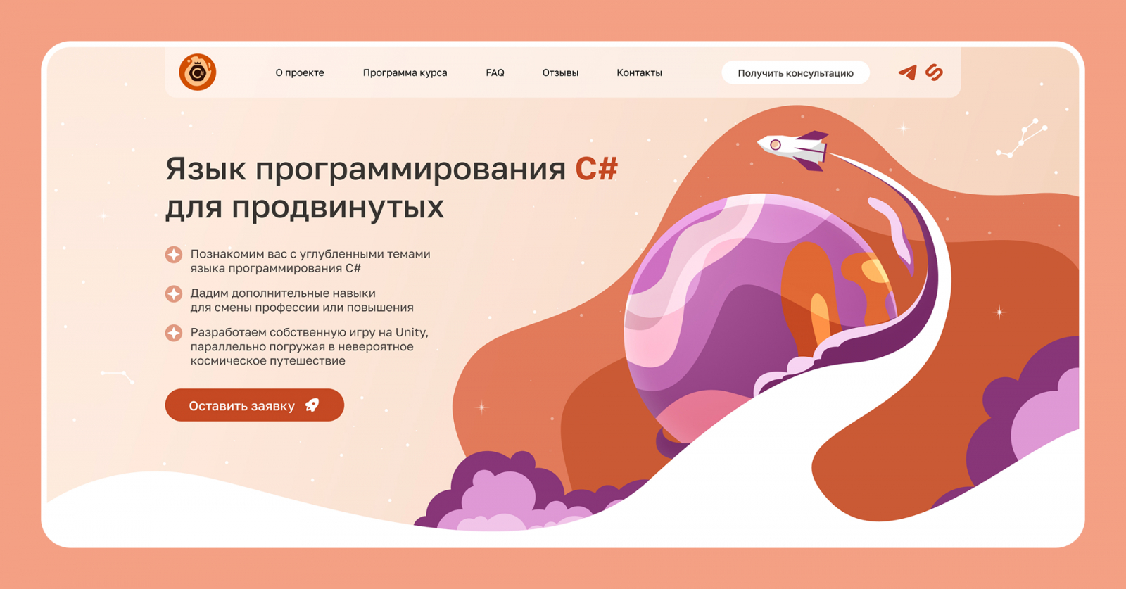 Команда завершила работу над лендингом примерно через 1,5 месяца после обращения. На выходе получилась посадочная, которая визуально совпадает с курсом: тот же комиксный космический язык, та же атмосфера, те же акценты на формате обучения.