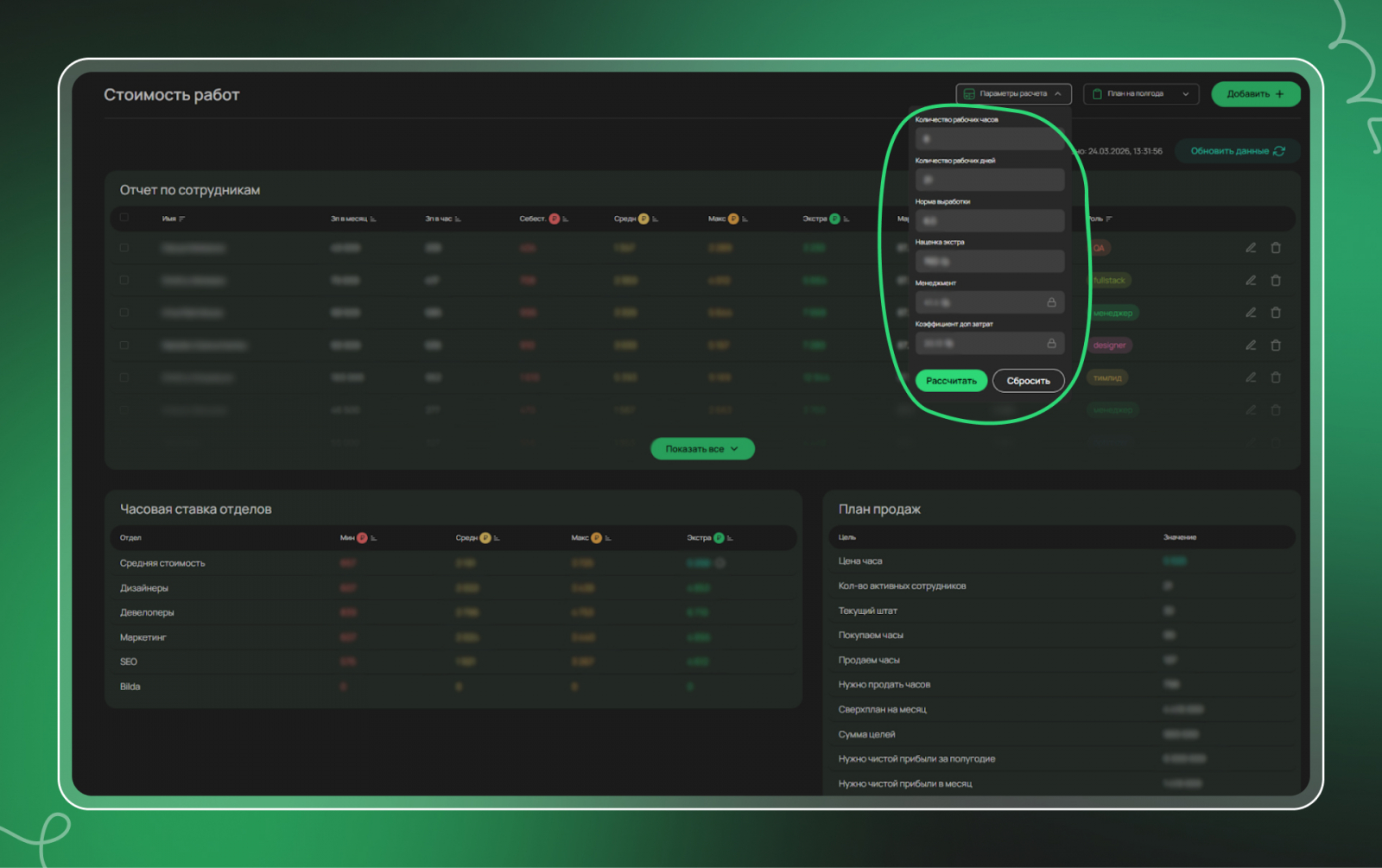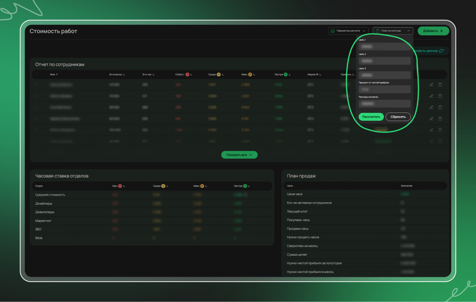 Сервис считает стоимость работ через набор параметров. Часть из них отвечает за общую финансовую рамку бизнеса, например, цели на период, расходы на месяц и желаемую прибыль.