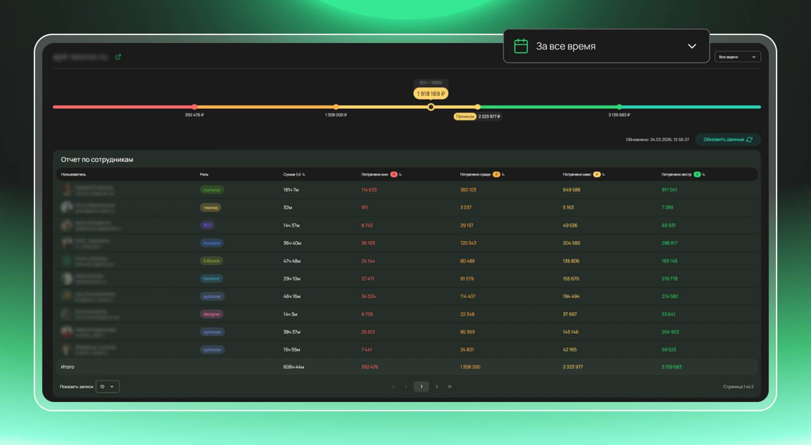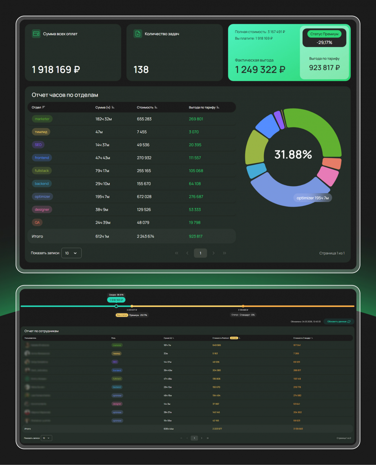 Работает это довольно просто по своей логике, хотя внутри расчёты, конечно, сложнее. Система берёт задачи и время из рабочего пространства, где команда ведёт проект. Дальше к этому времени привязываются реальные люди, которые выполняли работу, и реальные расходы компании. После этого всё сравнивается с оплатами клиента за выбранный период. В итоге получается не просто история о том, что было сделано, а модель реальной стоимости работ.