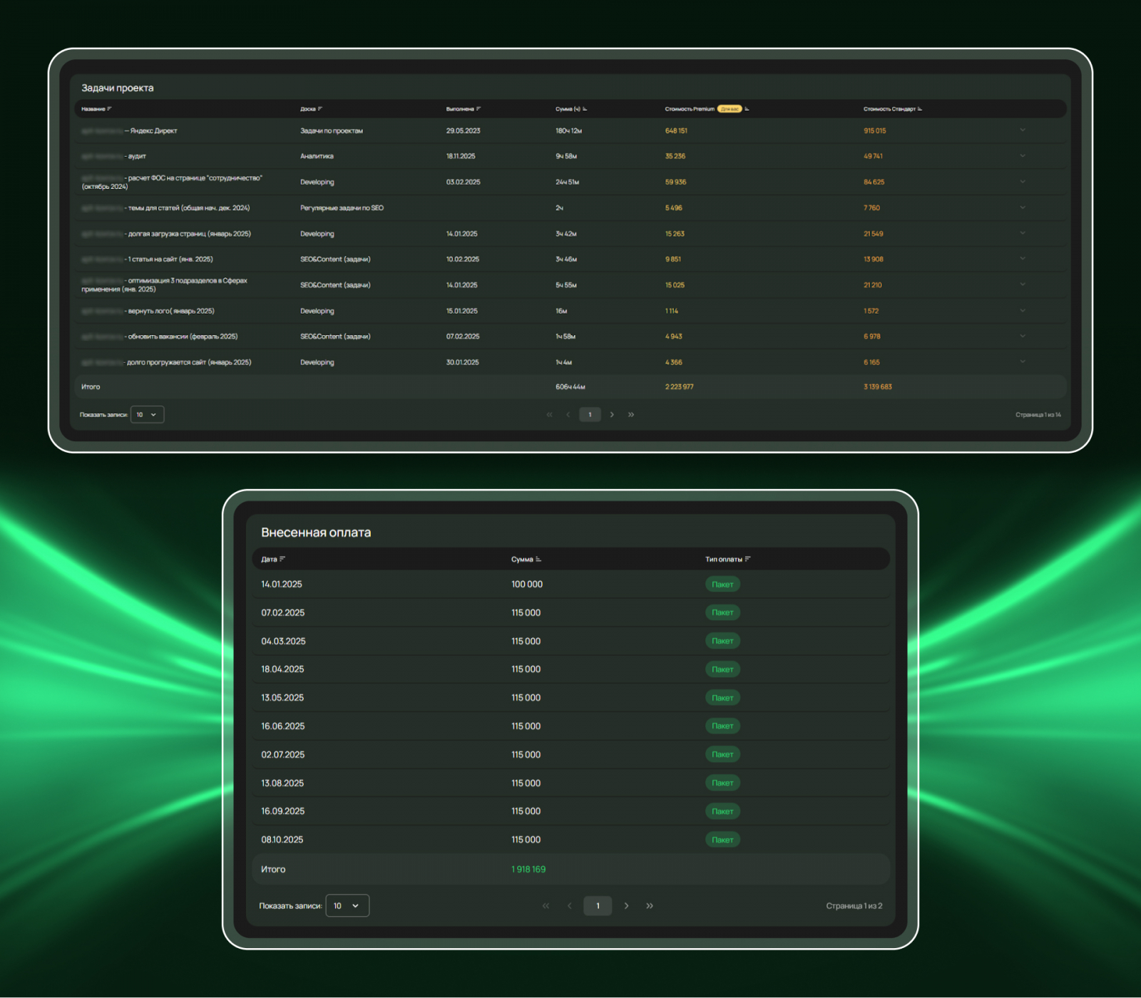 Для агентства система показывает другую сторону этой же картины. Здесь уже важны не только выполненные задачи, но и то, сколько реально стоит проект для команды. Где идёт перерасход. Где, наоборот, есть недоработка. Какие проекты выглядят нормально только на уровне ощущений, но по факту уже близки к убыточности. А какие, наоборот, можно усиливать, потому что по ним ещё есть запас.