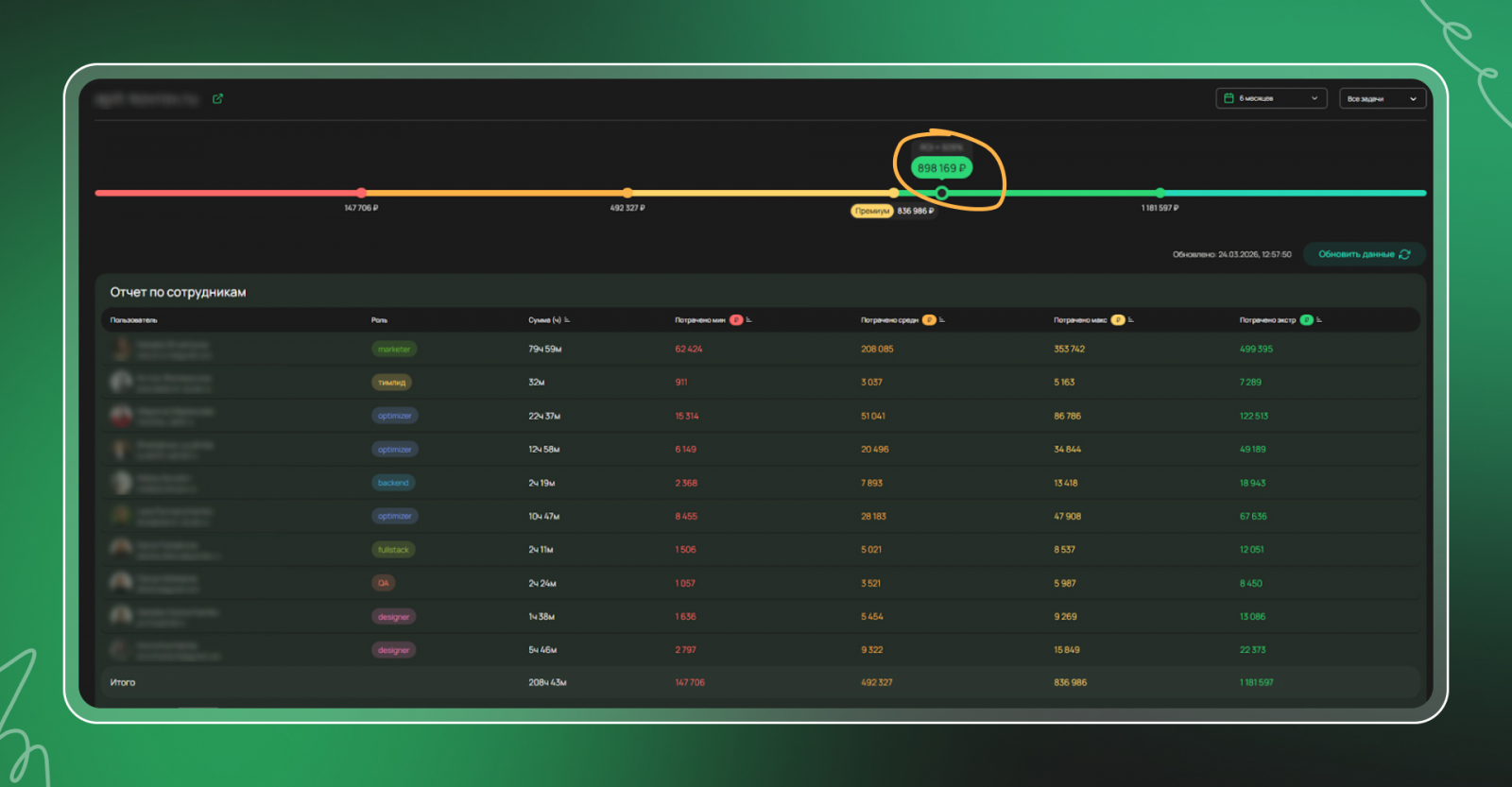 В спорных ситуациях особенно важно смотреть не только на один короткий период, а на проект в динамике. Например, за последние шесть месяцев может казаться, что по нему есть запас и команда даже не дорабатывает до плановой стоимости. А если открыть тот же проект за всё время сотрудничества, картина окажется другой: раньше по нему уже была переработка, и сейчас этот проект скорее выравнивается на длинной дистанции.