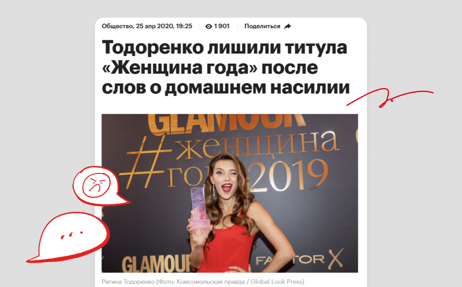 1. Кейс Тодоренко — довольно старый, 2020 года, но показательный. Ведущая дала интервью PeopleTalk, где оправдала домашнее насилие (напомню цитату: «А что ты сделала для того, чтобы он тебя не бил?»).