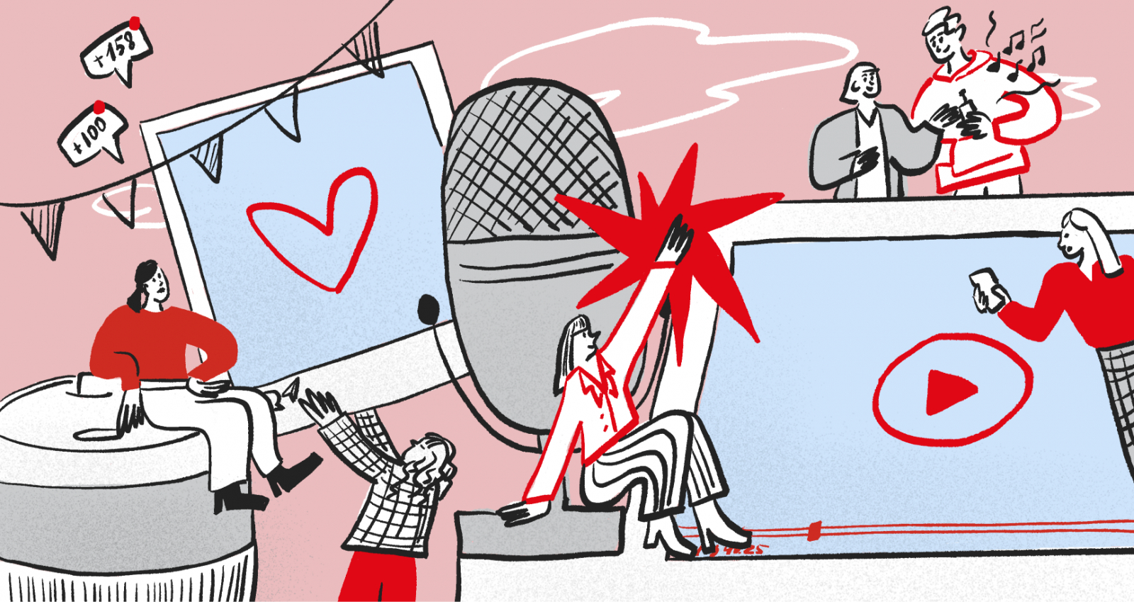 В итоге мне звонит Настя Плющева и смеется в трубку: «У нас есть название подкаста, но не знаем, зайдет ли тебе. “Репутация со свистом”». Звучало интересно, учитывая, что в школе у меня было прозвище «Свист». Но я не хотела, чтобы подкаст получился имени меня. Тут Дима Сидорин успокоил: «Слушай, свист, вообще-то, это часть профессии клакера. Они еще в XIX веке управляли настроением толпы — инициировали аплодисменты, смех, ну и свист». Нам понравилось, и на этом названии остановились.