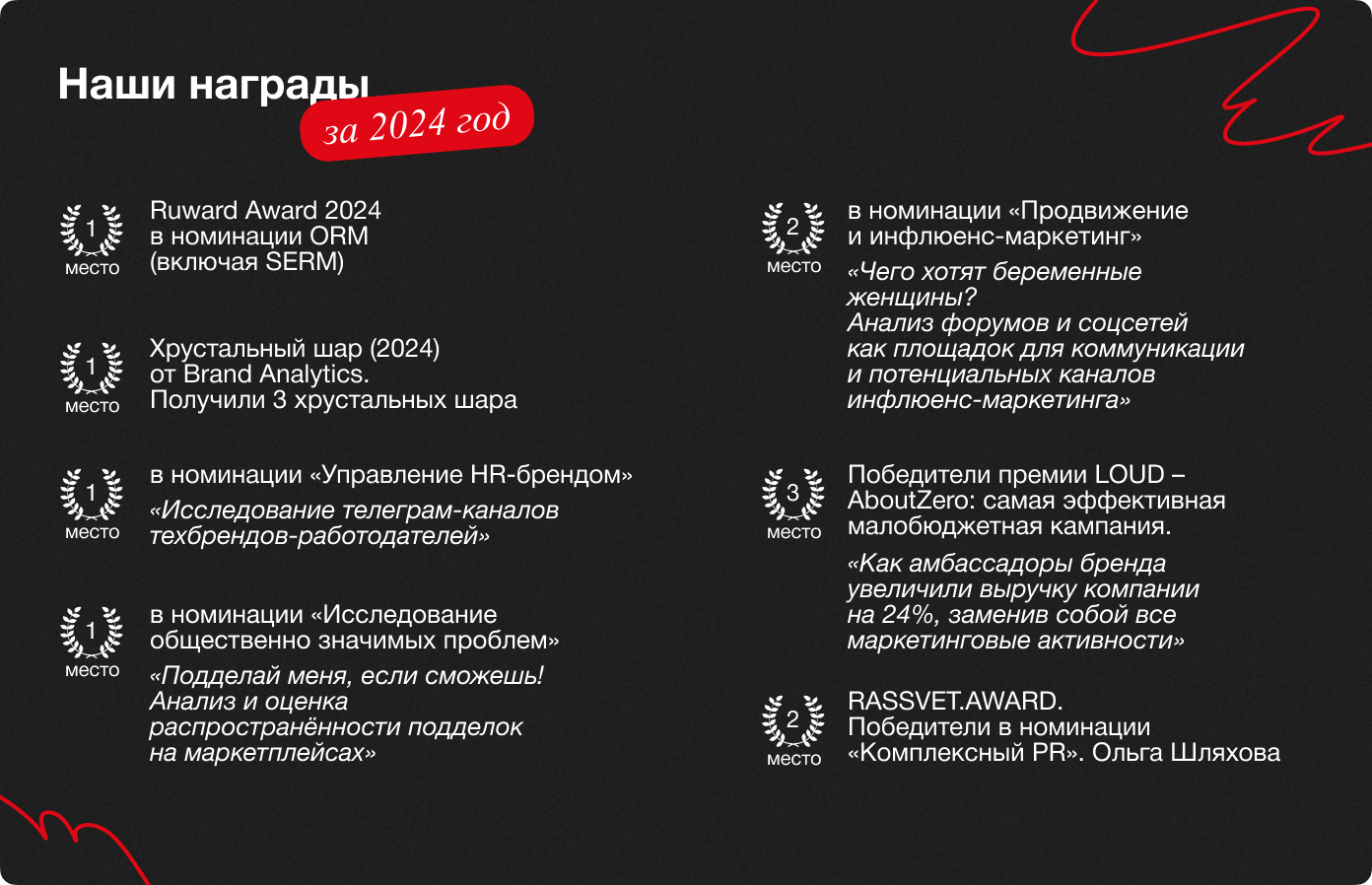 Забегу в начавшийся 2025 год, потому что первым ивентом в нем стала учрежденная нами премия Reputation Leaders. Это независимый рейтинг российских брендов с лучшей репутацией: эксперты SL оценили 129 участников из различных отраслей по показателям популярности в соцмедиа, присутствия в СМИ, тональности поисковой выдачи, отзывам и активности в соцсетях. О победителях и призерах рассказали в блоге.