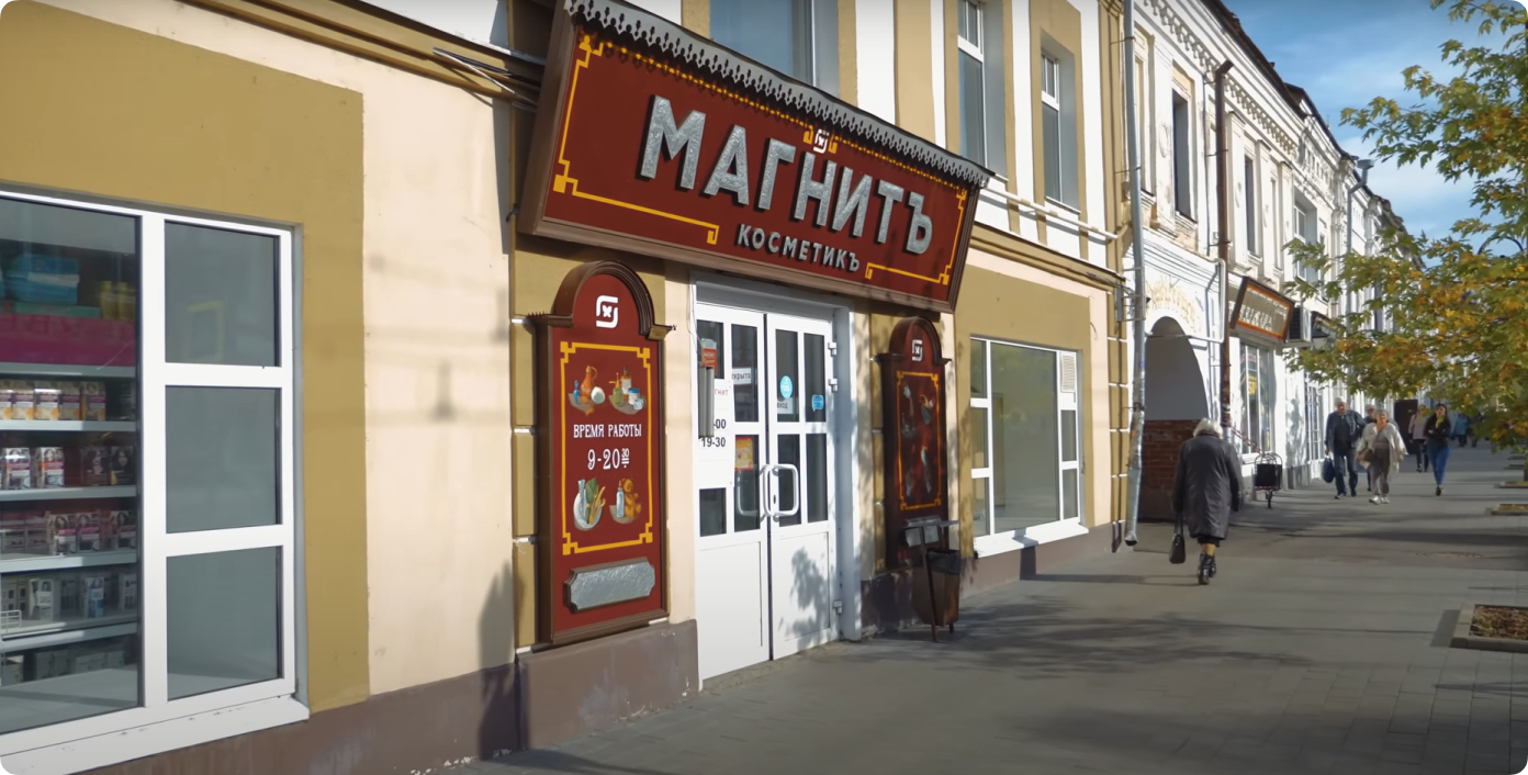 В Рыбинске магазины и банки оформляют вывески в дореволюционном стиле – пример яркого регионального брендинга. Даже федеральные сети (вроде Wildberries) поддерживают эту фишку города.