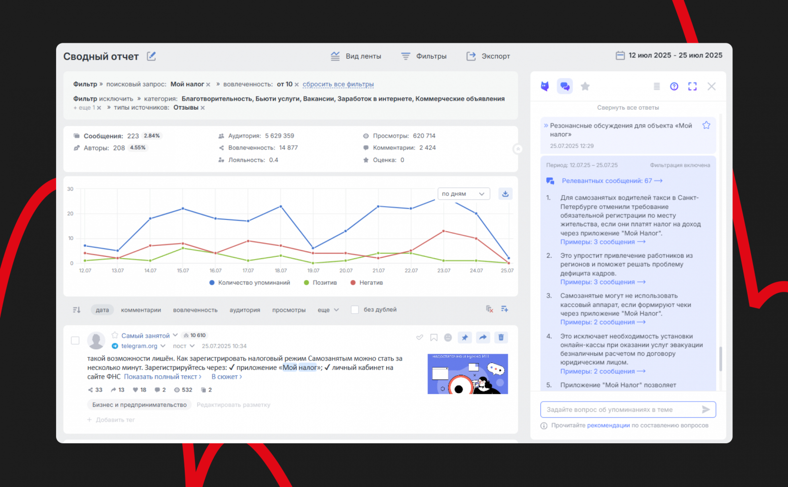 На первых этапах голова может идти кругом от массива сообщений, но дальше начнут выстраиваться закономерности и паттерны. Используйте искусственный интеллект внутри системы мониторинга — можно задать сценарий и получить сводку и даже провести SWOT-анализ.