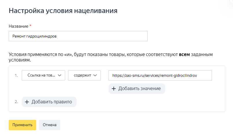 1. По всем услугам мы создали динамическую рекламную кампанию, в которой группы нацелены на соответствующие страницы сайта. Настройка нацеливания для группы Ремонт гидроцилиндров: