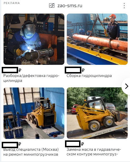 У нас получился фид с карточками по предоставляемым услугам в рамках ремонта гидроцилиндров и погрузчиков (в настройках товарной кампании с помощью фильтра можно выбрать показы только услуг по ремонту гидроцилиндров или погрузчиков — то есть создать отдельные кампании на основе одного фида по услугам).