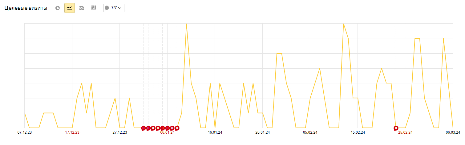 А это динамика получения конверсий по одной из важных для клиента целей. На выходных реклама не крутится по совместному решению с клиентом. Поэтому график вышел таким горо-образным.