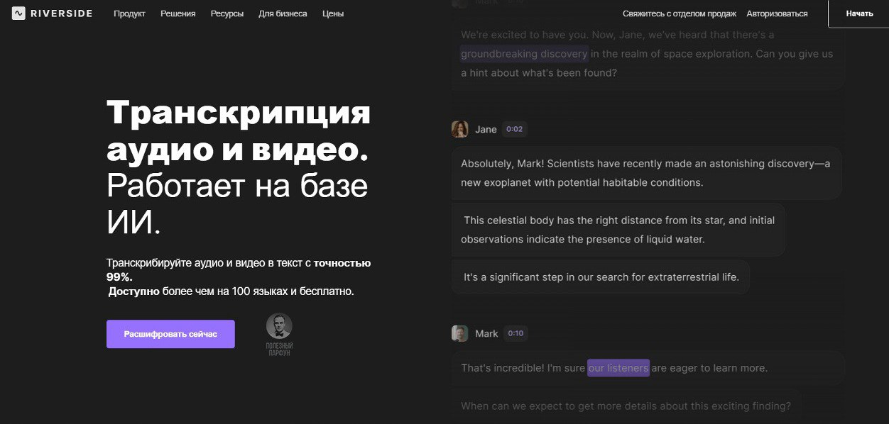 Будет полезной в любой копилке продуктивности. Riverside делает классный перевод аудио в текст, почти без провалов. Загружаете файл, жмёте кнопку и за секунду получаете полотно текста. В бесплатной версии можно транскрибировать суммарно два часа. И главное — нейросеть понимает русский.