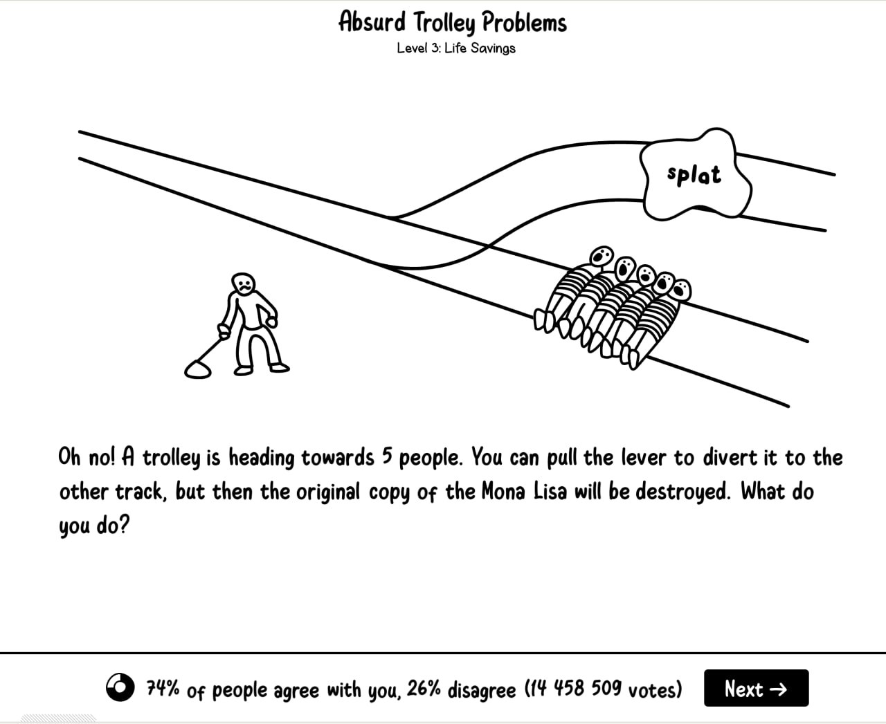 Вот ссылка, если хотите потерять 15 минут и веру в человечество. Вместо абстрактных людей тут — ваша бывшая, Мона Лиза, все деньги мира и пять лобстеров. Переход от осмысленного выбора к чистому стёбу как мне кажется гениальная иллюстрация того, что с нами делает бесконечный поток информации и принятия решений. В общем, идите, поиграйте.