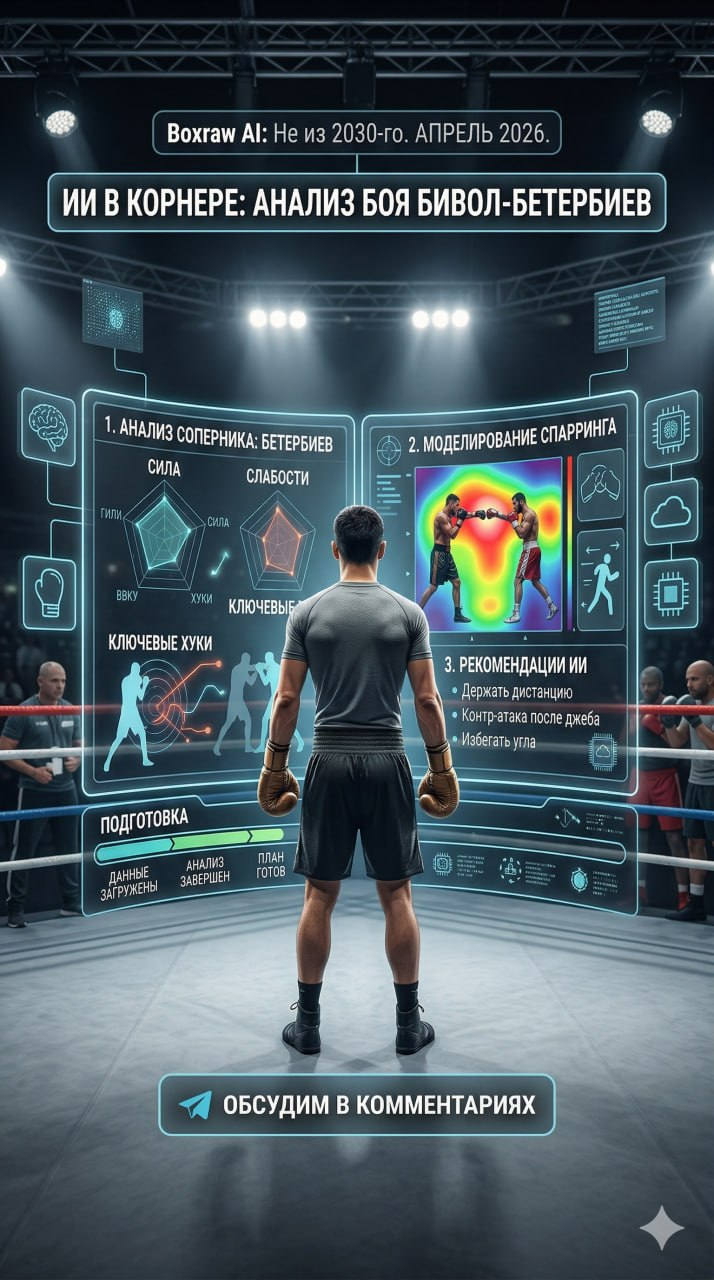 Перед первым боем к команде Бивола (для тех, кто не следит — это такой боксер) приехали ребята из Boxraw — они разрабатывают AI-программу для анализа боксёрских поединков. Загрузили в неё бои Артура и Дмитрия, и система разобрала сильные стороны обоих, нашла слабости, сделала нарезки — и выдала рекомендации. Бивол утверждает что попали во всё. Потом ей скормили видео спарринга — и она подсказала, что конкретно поможет победить. Единственное, чего программа не умеет это оценить выносливость, остальное, по словам Бивола, «прям чётко».