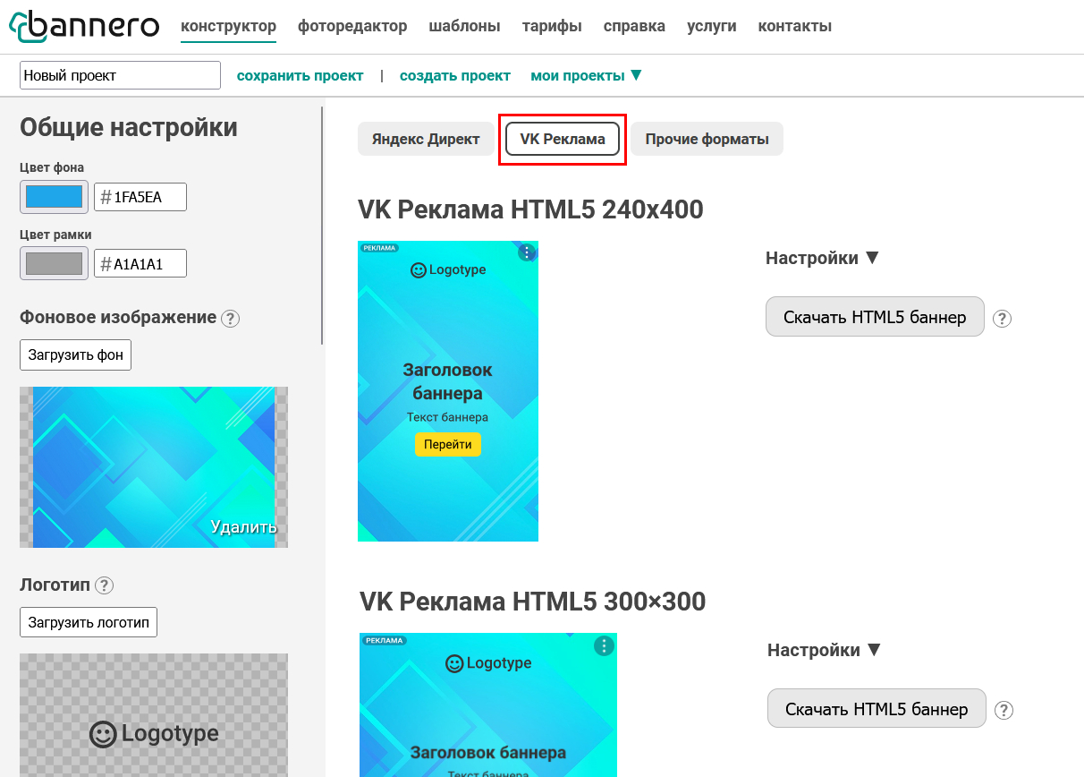 В Bannero вы можете сделать HTML5 с анимацией разных элементов баннера — текстов, кнопки, логотипа или фонового изображения. Чтобы создать креативы для VK Рекламы, перейдите в конструктор и после выбора шаблона откройте вкладку «VK Реклама»: