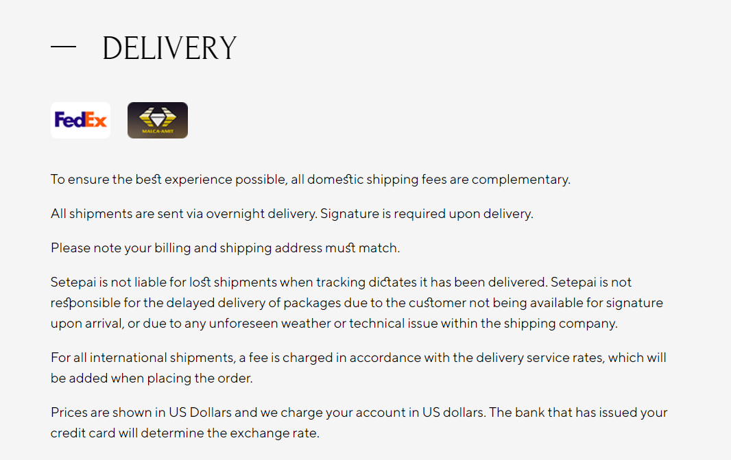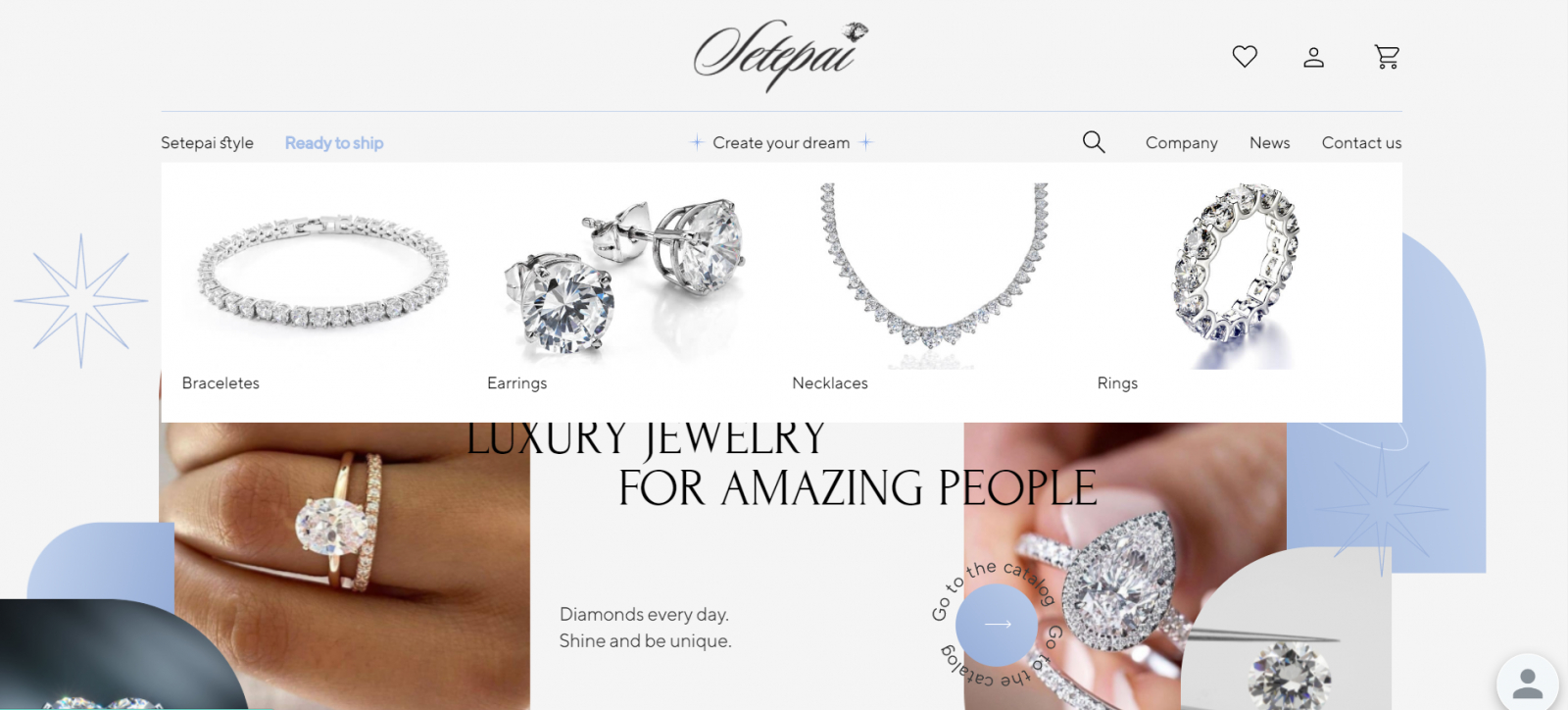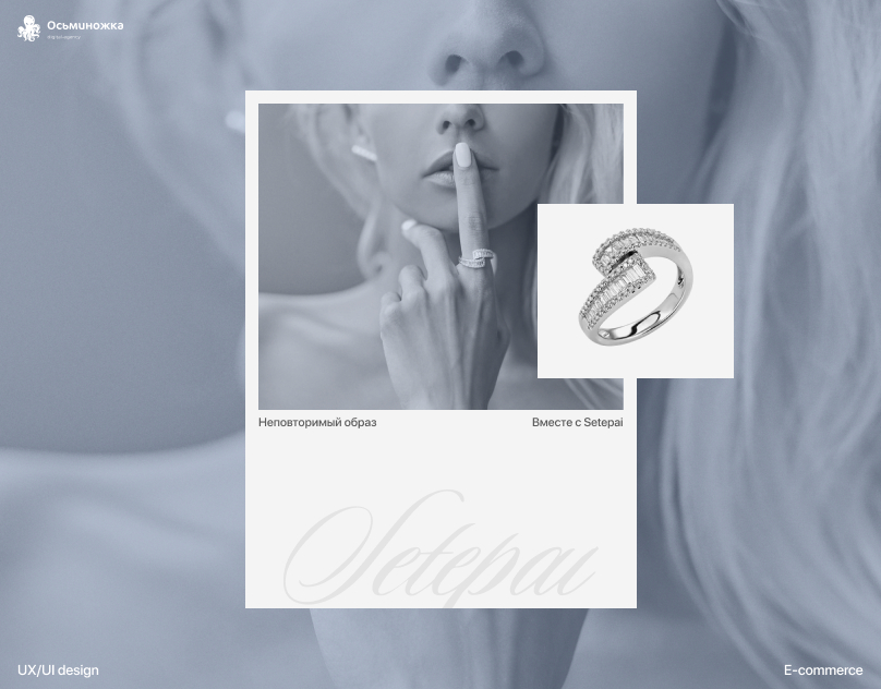 Setepai имеет чистый и элегантный дизайн с акцентом на высококачественные изображения украшений. Цветовая схема представляет собой сочетание приглушённых и нейтральных цветов, таких как белый, серый и голубой, для создания утончённого и современного образа. Эти цвета часто ассоциируются со спокойствием, умиротворением и ощущением легкости.
