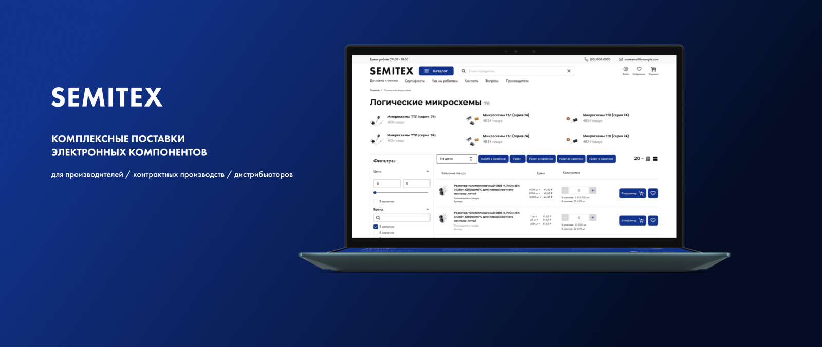 Semitex — российский дистрибьютор электронных компонентов, работающий на рынке с 1996 года. Компания поставляет продукцию ведущих производителей из России, Европы и Азии и специализируется на оптовых B2B-продажах. В числе клиентов — промышленные предприятия, инжиниринговые компании и интеграторы, которым важно стабильное качество, точная логистика и персональные условия поставок.