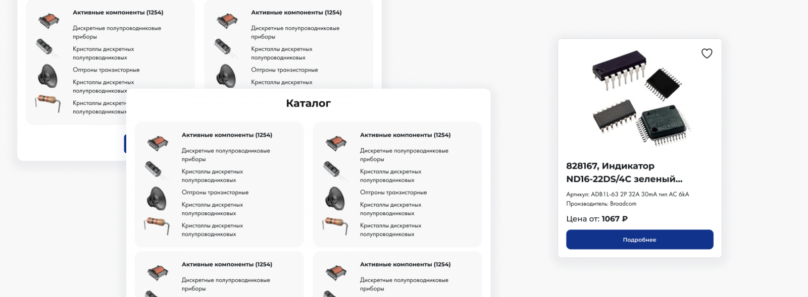 Каталог был спроектирован с учетом специфики отрасли: изображения у компонентов играют второстепенную роль, на первом месте — характеристики, наличие и цена. Мы реализовали табличную верстку каталога и карточек, где все важные параметры видны сразу — без перехода внутрь карточки. Такой подход позволяет быстро сравнивать и добавлять позиции в заказ.