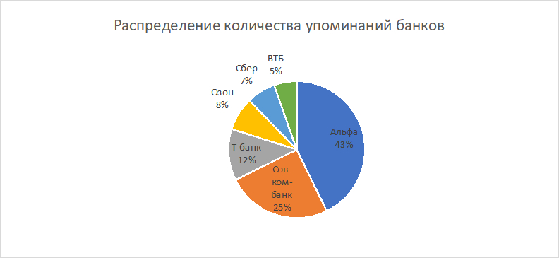 С точки зрения рыночной логики можно было бы ожидать наибольшую долю от Сбера, однако в реальности распределение упоминаний выглядит несколько иначе (и, к слову, отличается, от нашей «юнговской» выборки):