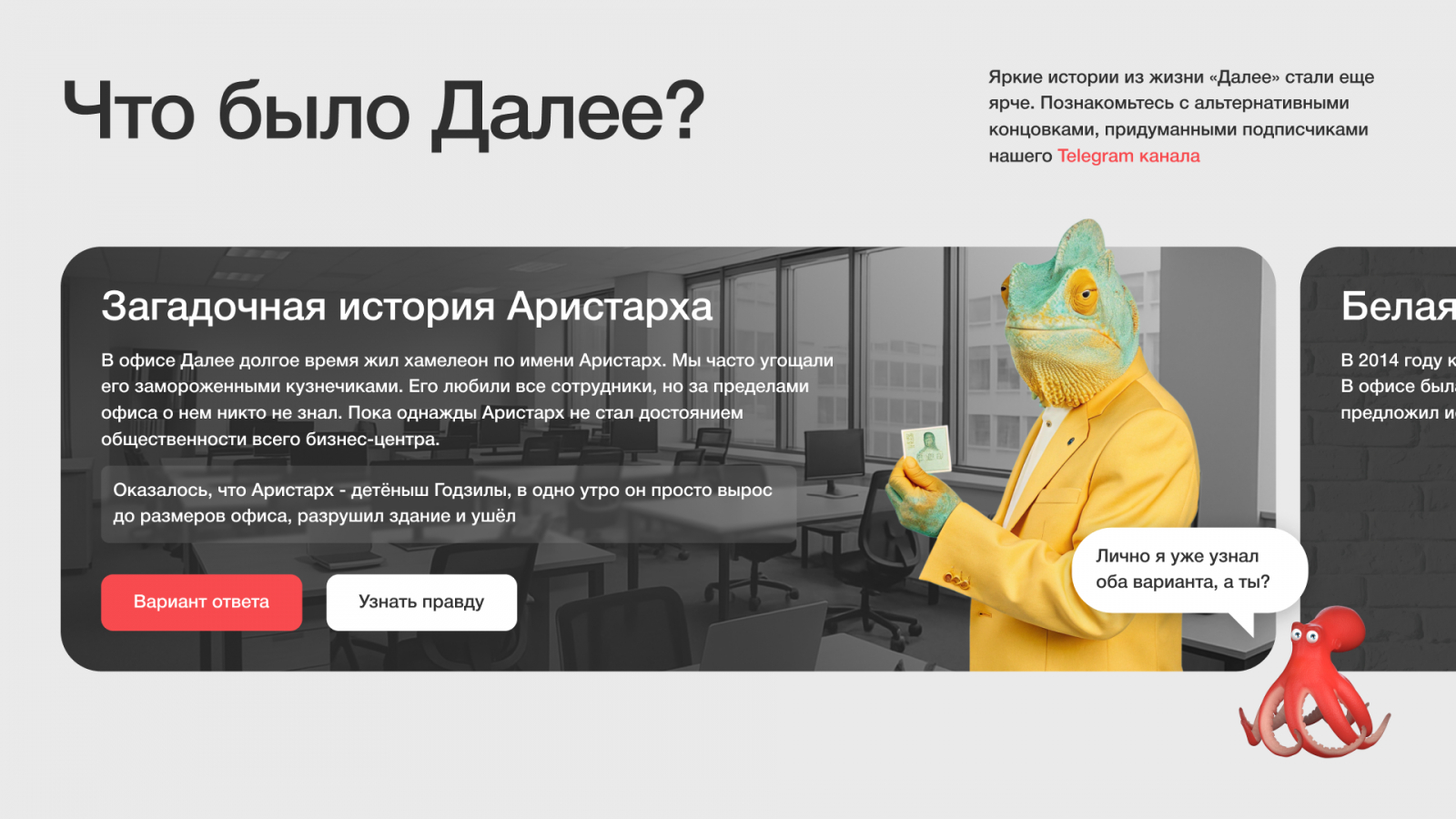 В этом разделе рассказали о том, как живет компания. Хотелось сделать это интересно и с юмором. Например, на странице есть интерактив «Что было далее», основанный на концепте шоу ЧБД: пользователи знакомятся с реальными историями из жизни агентства, могут придумать свой финал или узнать как все сложилось в реальной жизни. Еще до публикации лендинга мы размещали эти истории в своем ТГ-канале и просили подписчиков придумывать альтернативные концовки. Сами истории тоже появились в результате интервью с сотрудниками. Конечно, не все что мы узнали в процессе бесед, прошло цензуру и вышло в паблик.