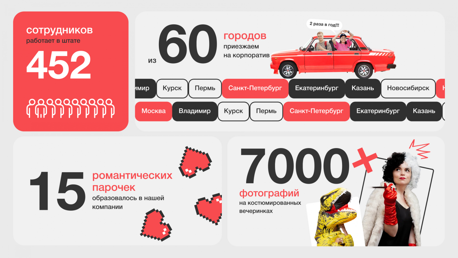 На этой странице мы также собрали основные факты и цифры о компании, куда вошли не только «серьезные» показатели вроде количества клиентов, проектов, городов, в которых живут и работают наши сотрудники, но и такие занимательные факты как количество романтических парочек, которое образовались в компании, или соотношение домашних животных на созвонах (кошки, конечно, победили).