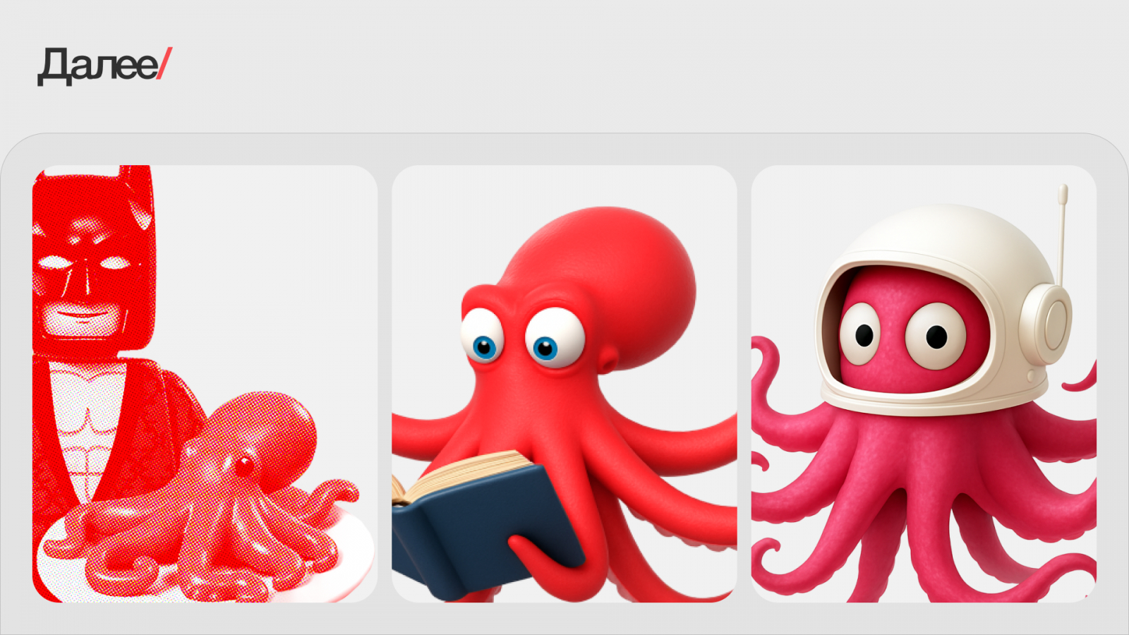 В этом году у «Далее» появился маскот — осьминог Октик. Он победил в конкурсе маскотов, которые рисовали сотрудники компании. Щупальца осьминога — это метафора Далее: за последние два года продакшен вырос в группу компаний, внутри которой несколько самостоятельных агентств с разной специализацией в диджитале. Маскота нарисовал и представил Павел Крыловской, дизайнер Далее. Новому герою пришлось пройти несколько этапов отбора и народное голосование.