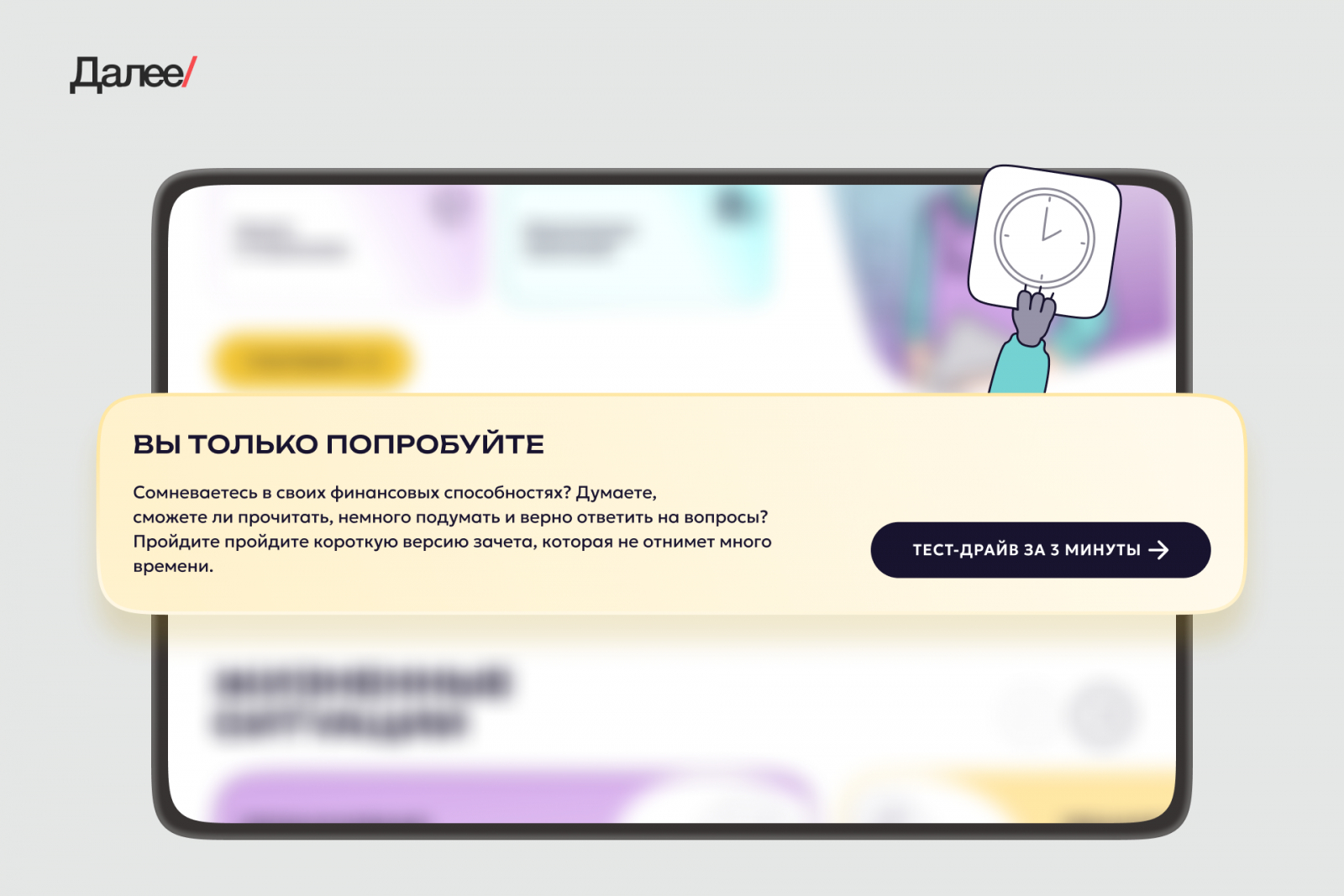 На главной странице появился короткий тест-драйв из 3-х вопросов для незарегистрированных пользователей. Это крючок для вовлечения. Посетитель быстро пробует свои силы, а потом решает — стоит ли проходить весь зачет.