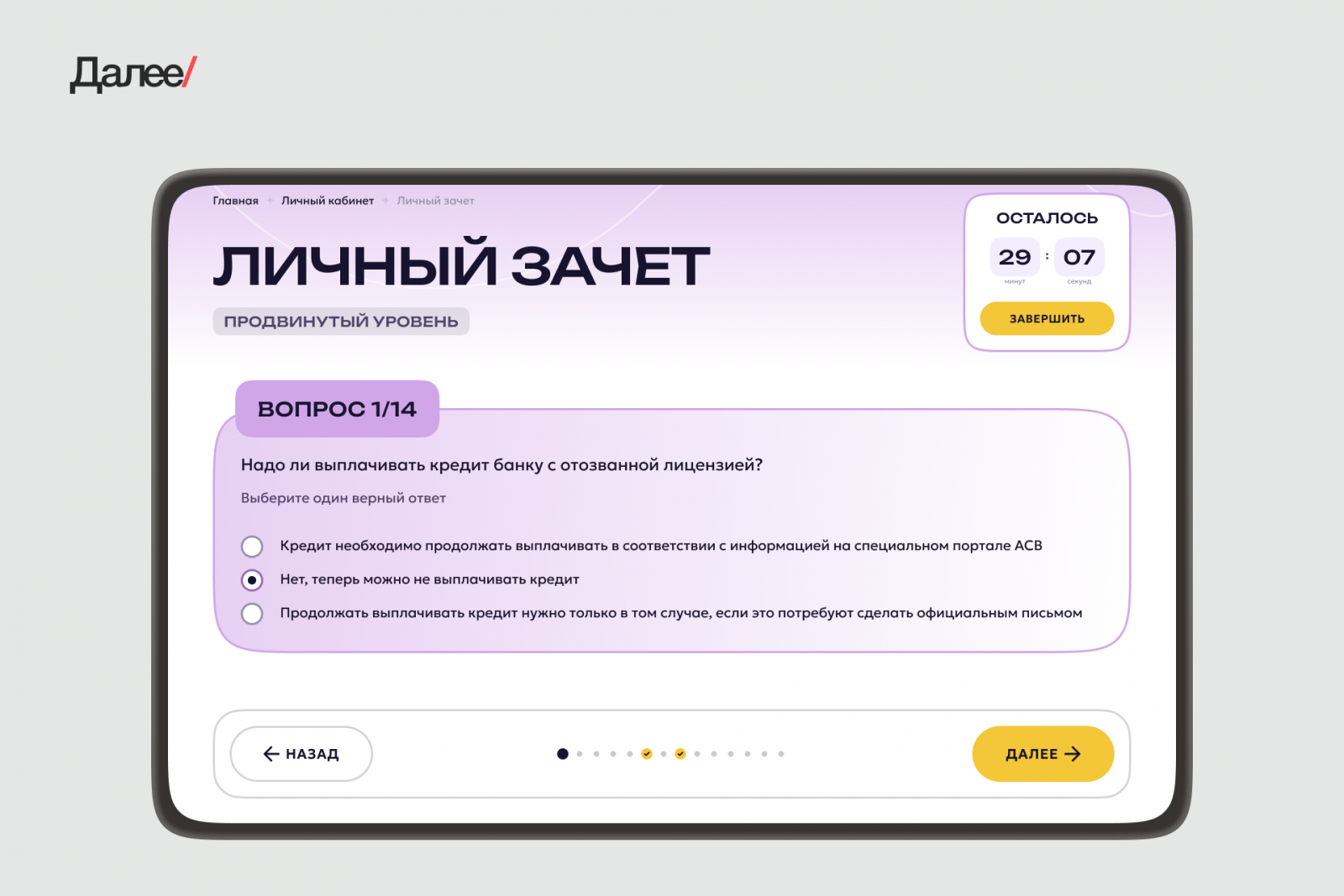 Уделили больше внимания инклюзивности — жирные шрифты, акценты, переключение на монохромную тему для слабовидящих. А чтобы снизить тревожность при прохождении зачета, добавили пагинацию с индикаторами. Это простое, но критически важное UX-улучшение. Оно дает понимание, на что ты уже ответил и сколько осталось до конца теста.