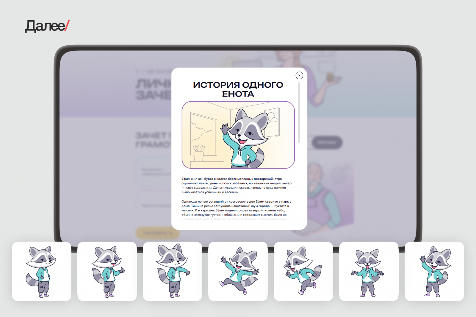 Одним из главных нововведений этого года стал енот Ефим — интерактивный гид, который делает опыт более живым и эмоциональным. Совместно с партнерами из Банка России мы пришли к концепту маскота. Доработки и адаптацию персонажа выполняла дизайн-команда Далее.