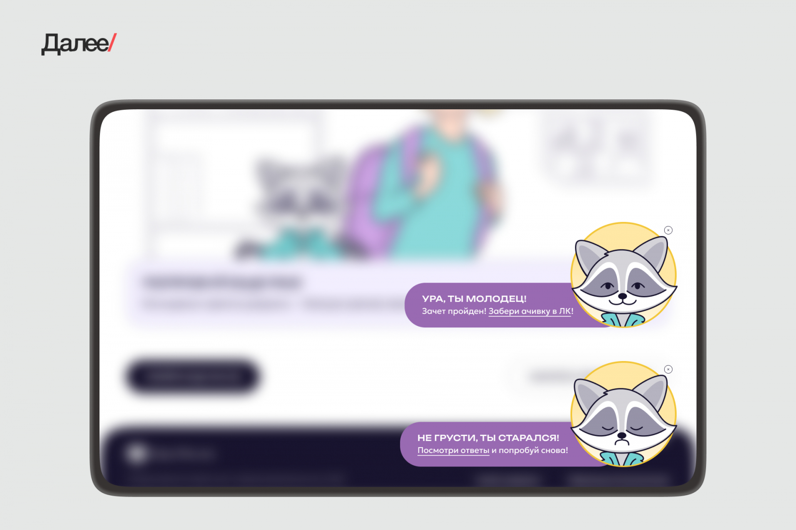 Маскот разряжает обстановку, вовлекает в процесс и напоминает, что ты не на экзамене. Он приветствует посетителя на главной, а в конце тестов дает советы — в зависимости от успешности прохождения. За активность на платформе — дарит ачивки.
