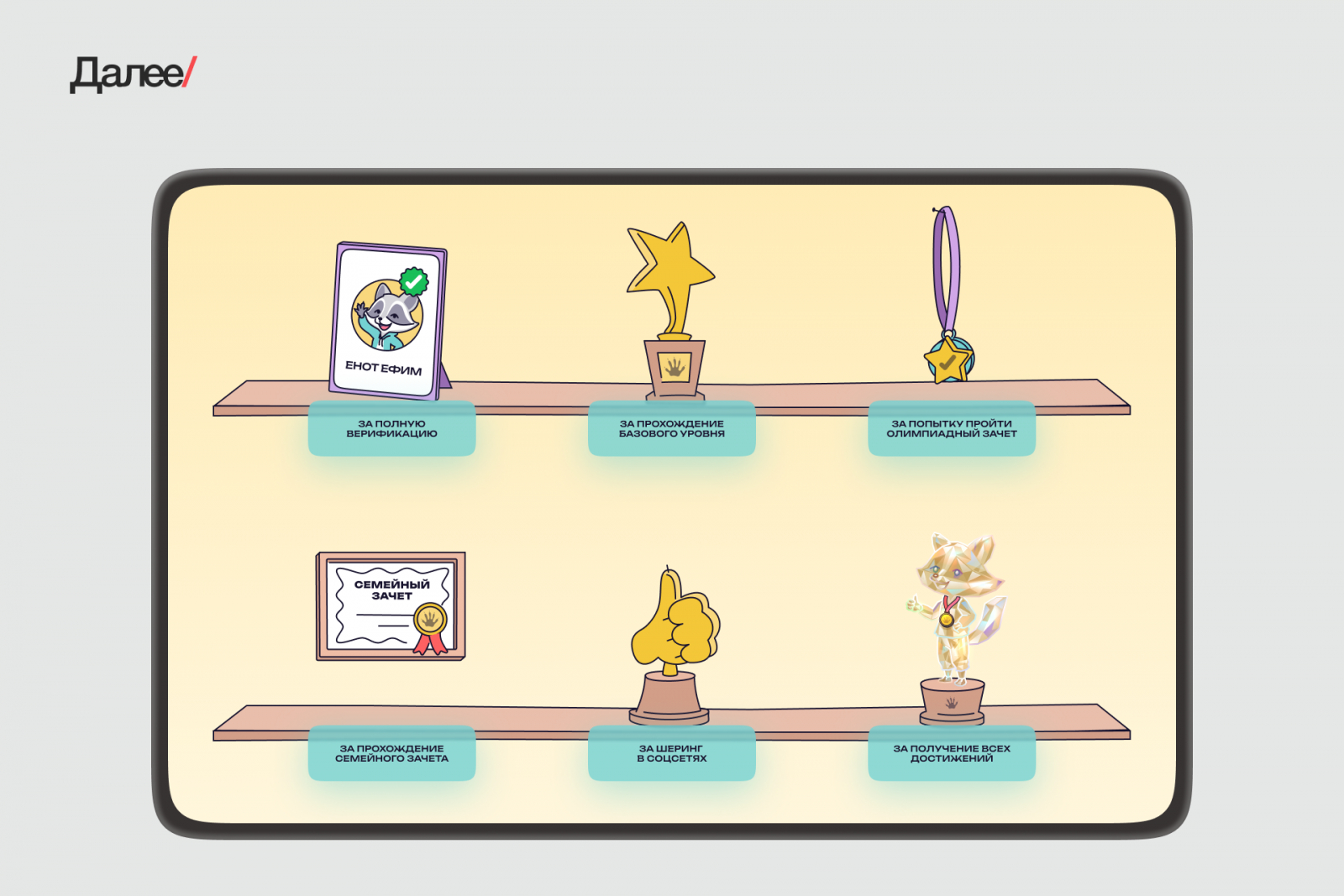 Все ачивки мы поместили в Зале славы, в который можно попасть через ЛК. Самая важная из них — Хрустальный енот, созданный по мотивам совы из интеллектуальной игры «Что? Где? Когда?».