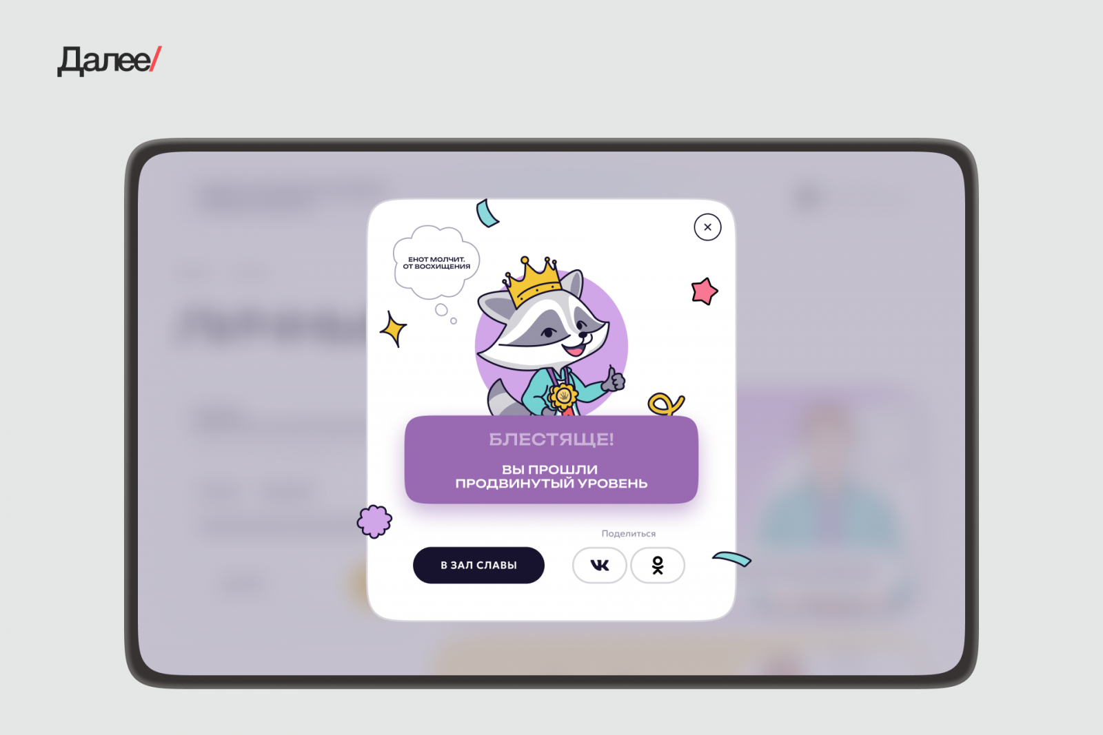 Мы сделали два разных Зала славы — для детей и взрослых, с уникальными ачивками у каждой аудитории. Полученную награду можно тут же пошерить в VK или OK.