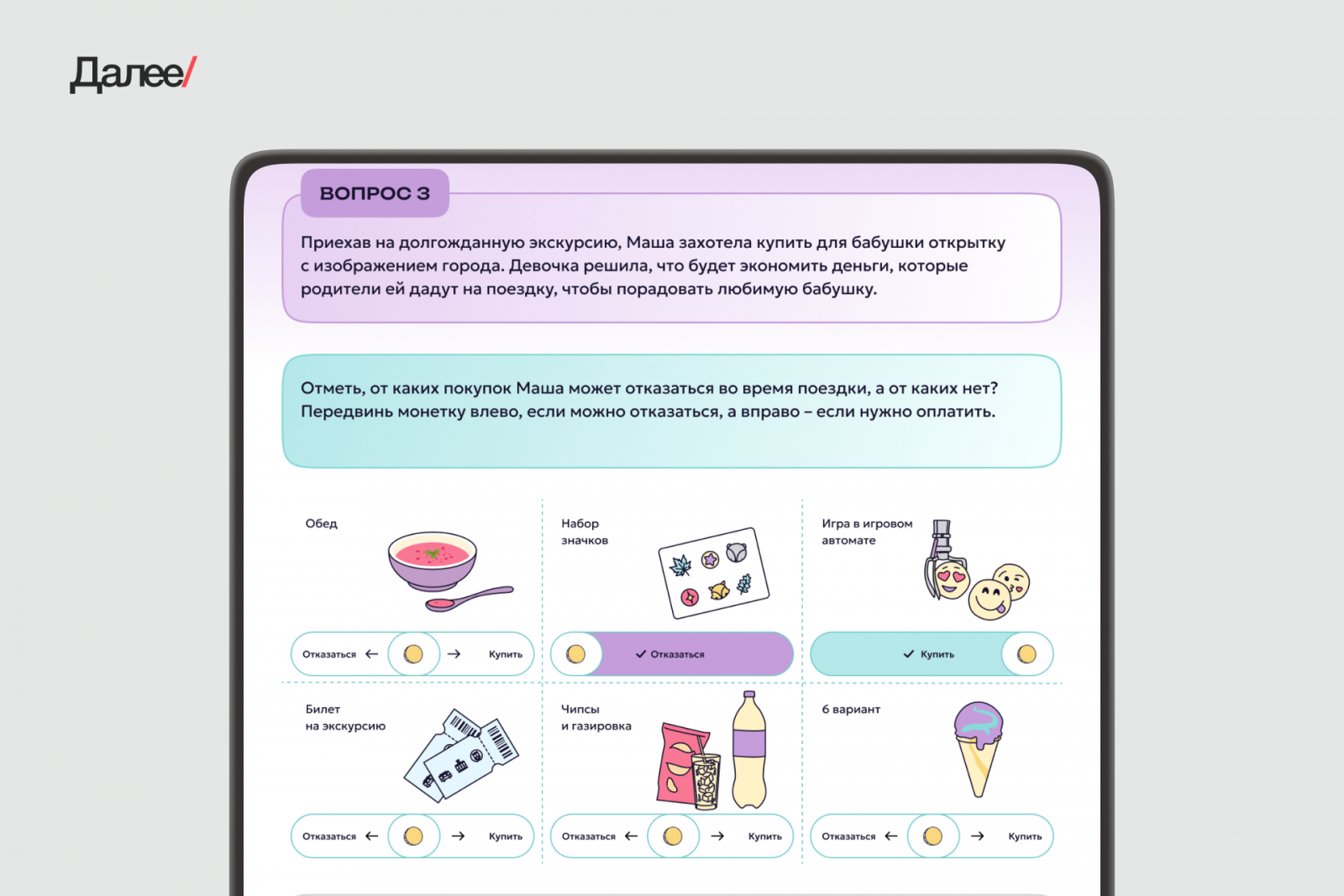 На сайте мы разделяем интерфейсы на личный, семейный и олимпиадный зачет. У каждой группы — свои сценарии и вопросы, которые система формирует из базы данных на основе возраста и жизненных ситуаций. Исключение — олимпиадный зачет, задания для которого разрабатывают преподаватели ВШЭ. Здесь проверка для всех едина и пройти ее можно только в течение 3-х дней из 21.