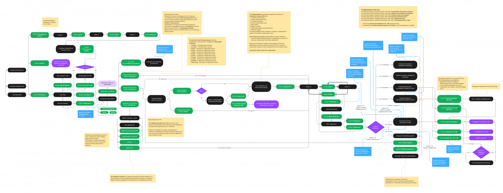 UJM показывает, как участник проходит зачет — от первого визита на главную страницу до получения сертификата или ачивки. Для каждой аудитории своя траектория: с разными входами, логикой вопросов и возможными ответвлениями.