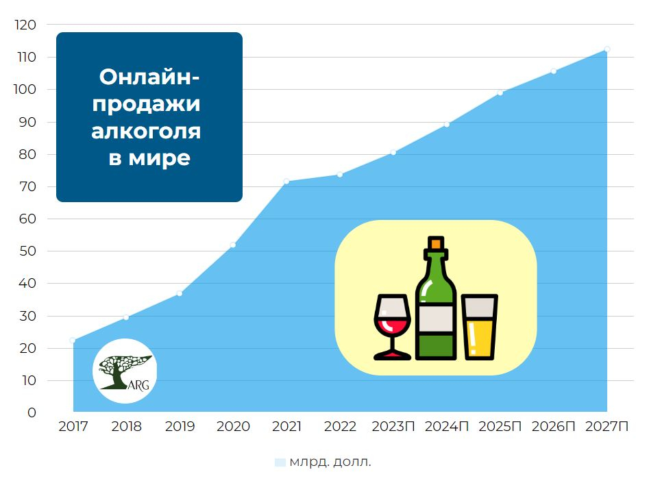 Объем онлайн-рынка дистанционной торговли алкогольной продукцией в мире в 2022 году превысил 73 млрд. долларов, а к 2027 году он может составить более 100 млн. Такие данные приводит компания «AnalyticResearchGroup» в исследовании «Интернет-торговля в России: алкоголь», выпущенном весной 2023 года.